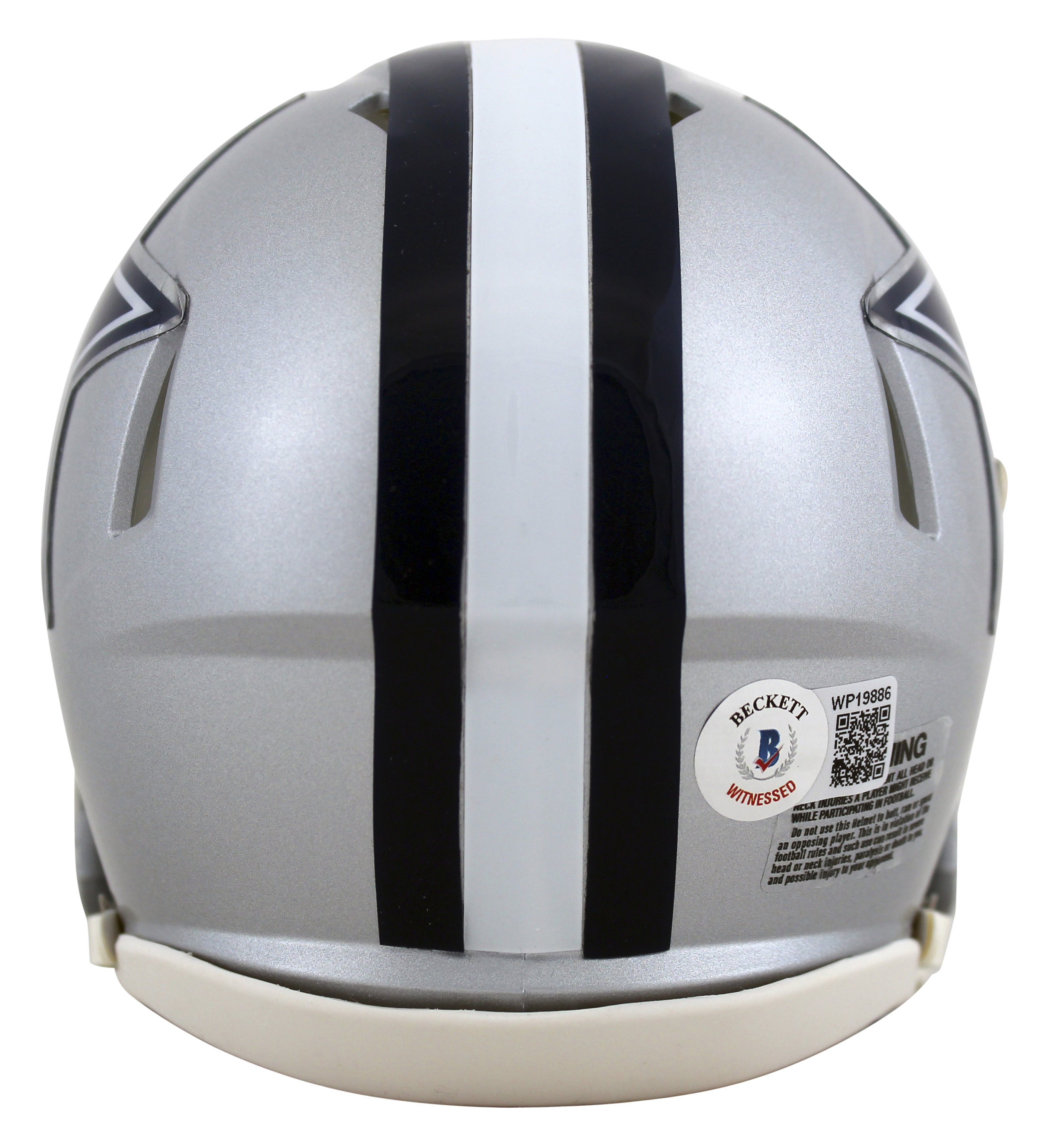 This Autographed Silver Speed Mini Helmet has been Personally Signed by Dak Prescott of the Dallas Cowboys. This item is 100% Authentic to include a hologram by Beckett Authentication Services. This item will come with the new Beckett Authentication hologram that has a scannable QR code rather than the traditional COA. If you would like to have a COA, you are welcome to reach out to Beckett for a printed certification once you receive your item. This is a BAS Witnessed Protection Program item which means a Beckett Authentication Service representative was present when this item was being signed. We conducted an autograph signing with Dak Prescott where multiples of the same item were signed. While the photographs are representative of this item, the size, placement and strength of the signature may vary. Each item is hand signed, therefore, each autograph is unique. This item can be verified through BAS Witnessed.