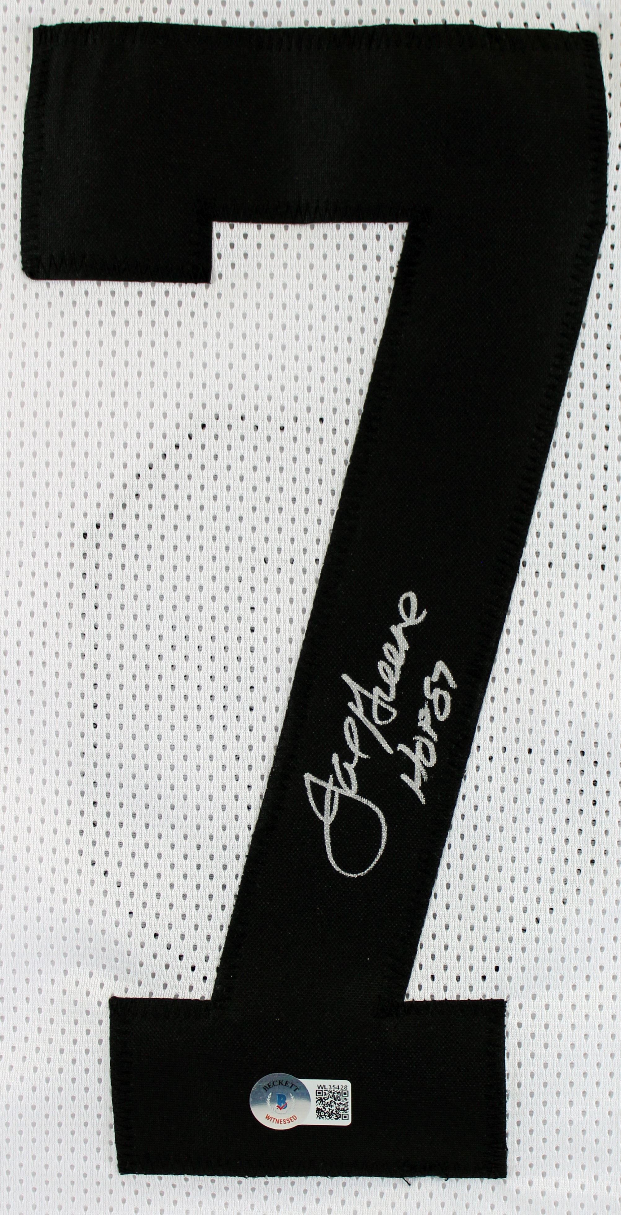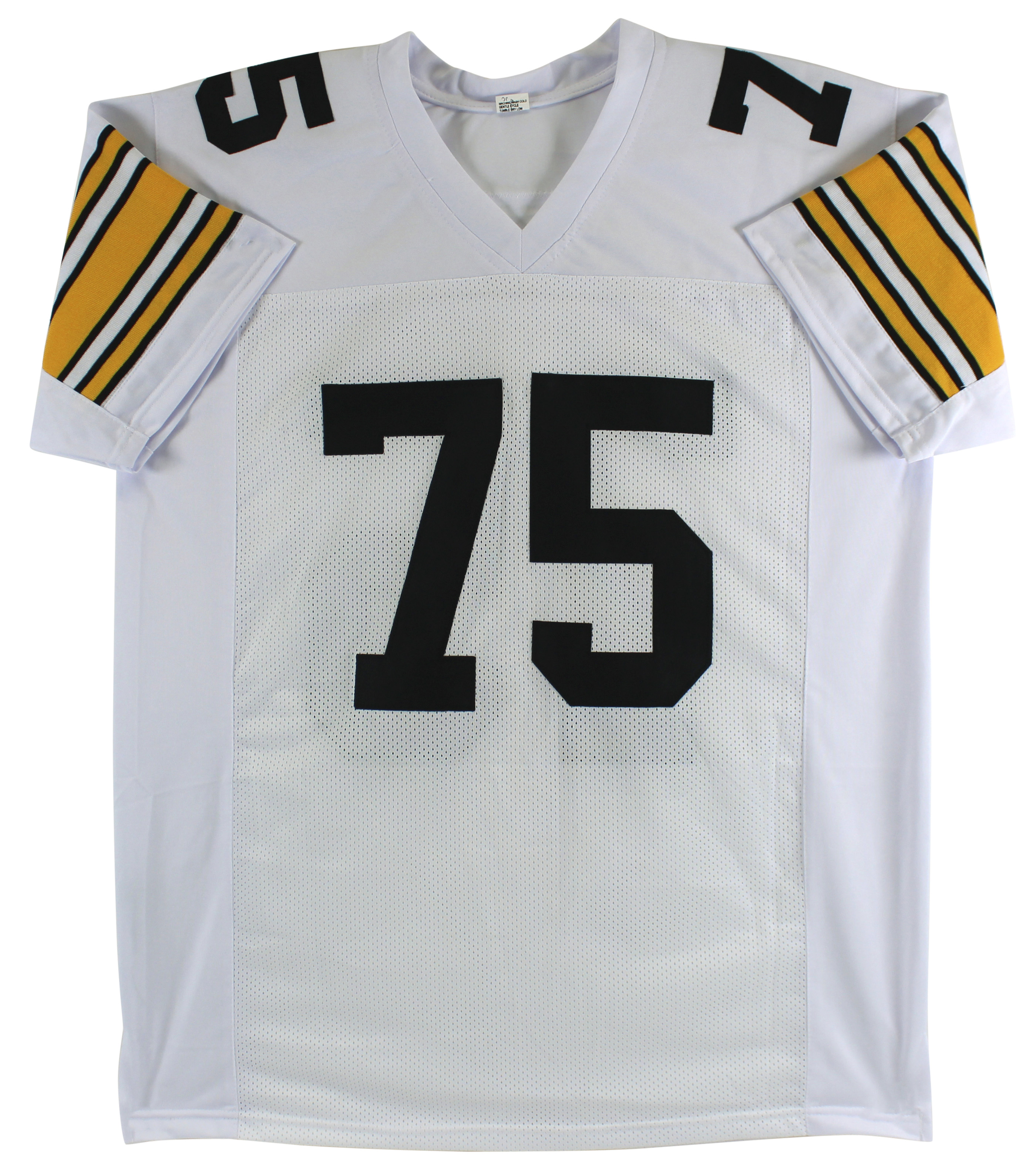 This Autographed White Pro Style Jersey with the inscription of "HOF 87" has been Personally Signed by Joe Greene of the Pittsburgh Steelers. This item is 100% Authentic to include a Certificate of Authenticity (COA) / hologram by Beckett Authentication Services. This is a BAS Witnessed Protection Program item which means a Beckett Authentication Service representative was present when this item was being signed. This is a stock item. We conducted an autograph signing with Joe Greene and we have several of these available. The one you will receive will be of equal quality to the one pictured. This item can be verified through BAS Witnessed. This is a X-Large sized, non-branded, custom-stitched Jersey.