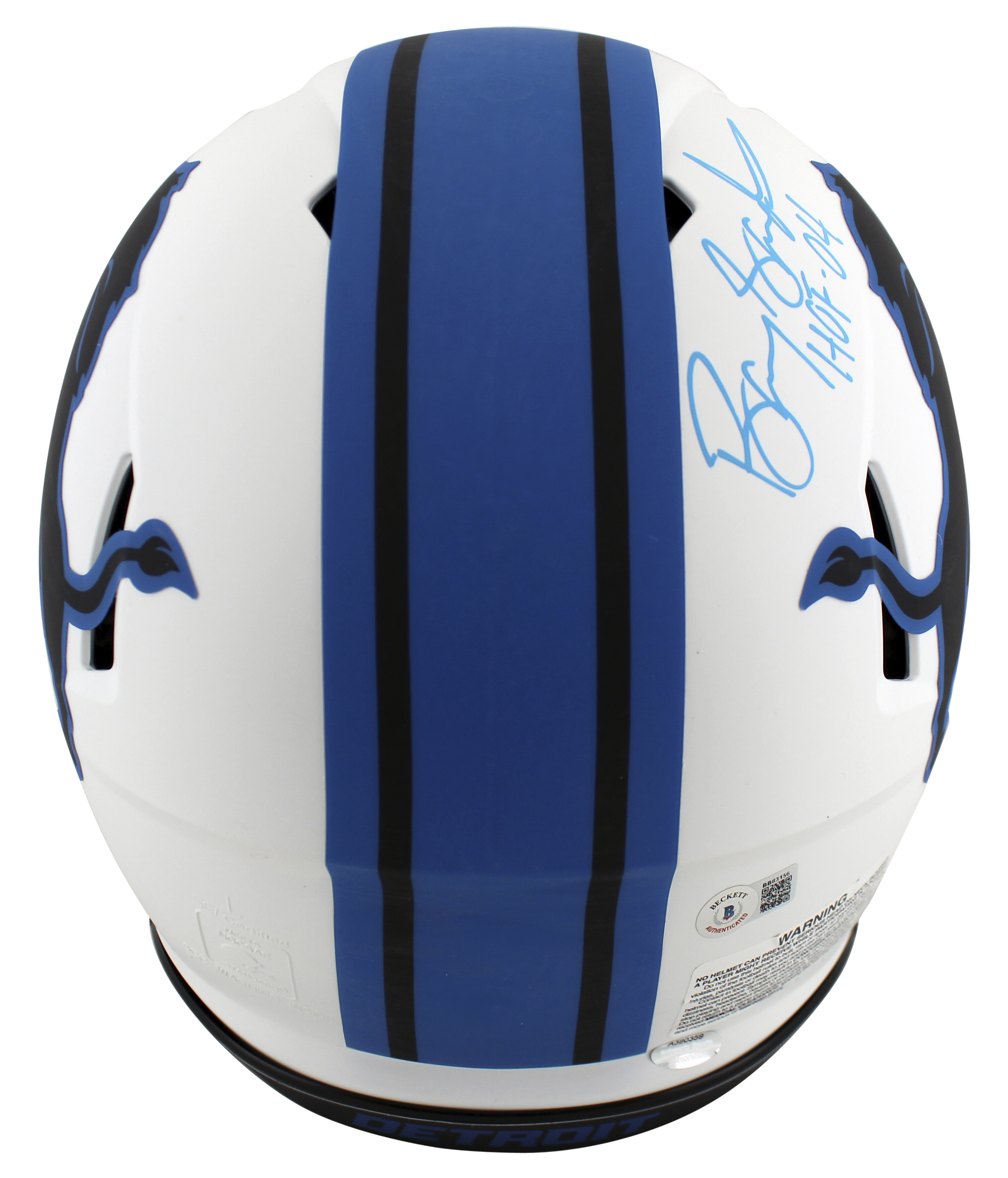 This Autographed Alternate Lunar Riddell Authentic Full Size Speed Proline Helmet with the inscription of "HOF 04, The Lion King" has been Personally Signed by Barry Sanders of the Detroit Lions. This item is 100% Authentic to include a Certificate of Authenticity (COA) / hologram by Beckett Authentication Services. This is a stock item. We conducted an autograph signing with Barry Sanders and we have several of these available. The one you will receive will be of equal quality to the one pictured. This item can be verified through BAS.