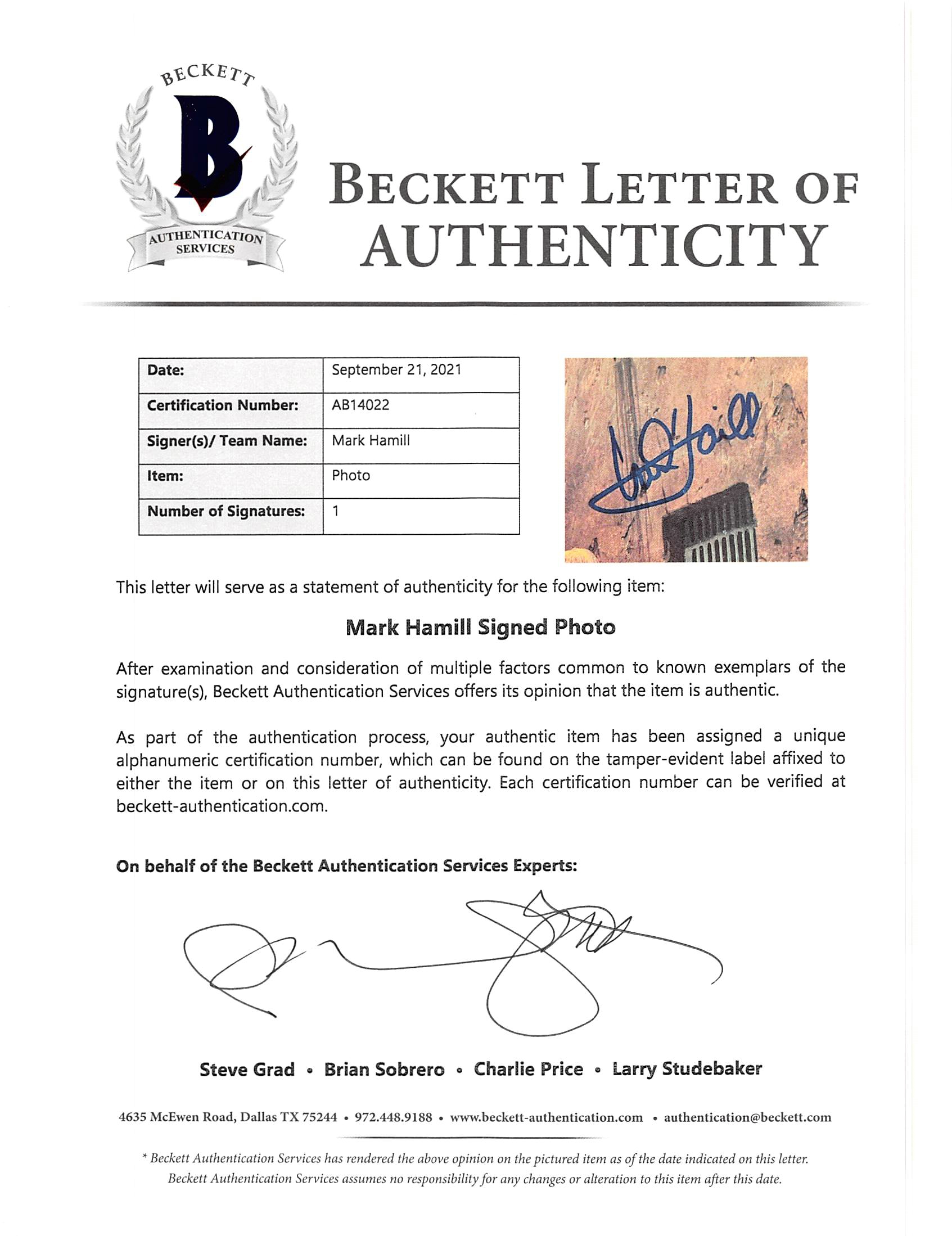 This Autographed 11x15.25 Photo has been Personally Signed by Mark Hamill of Star Wars Return of the Jedi. This item is 100% Authentic to include a Certificate of Authenticity (COA) / hologram by Beckett Authentication Services. The authenticity can be verified on Beckett Authentication Services website.