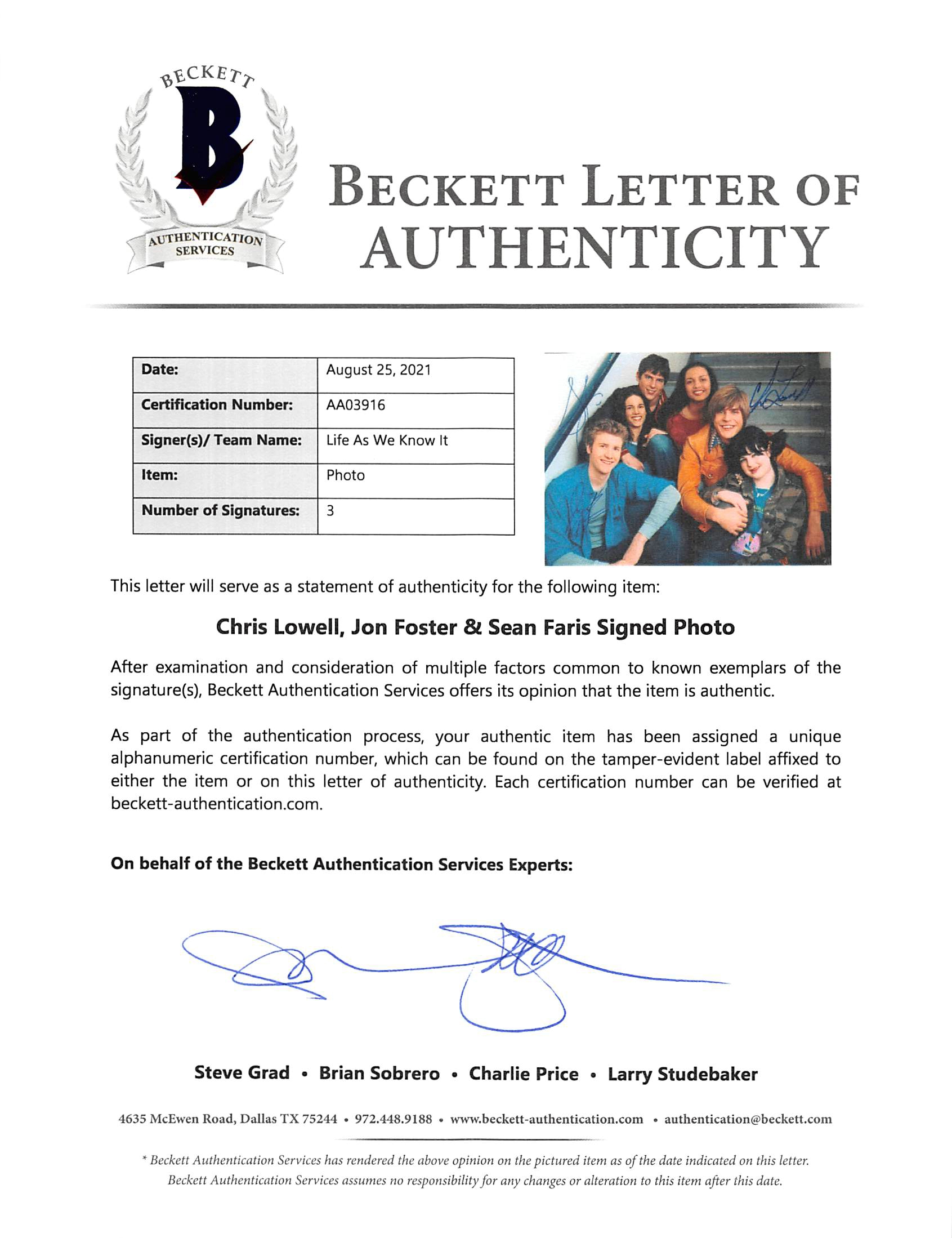 This Autographed 11x14 Photo has been Personally Signed by Chris Lowell, Jon Foster & Sean Faris of Life As We Know It. This item is 100% Authentic to include a Certificate of Authenticity (COA) / hologram by Beckett Authentication Services. The authenticity can be verified on Beckett Authentication Services website.