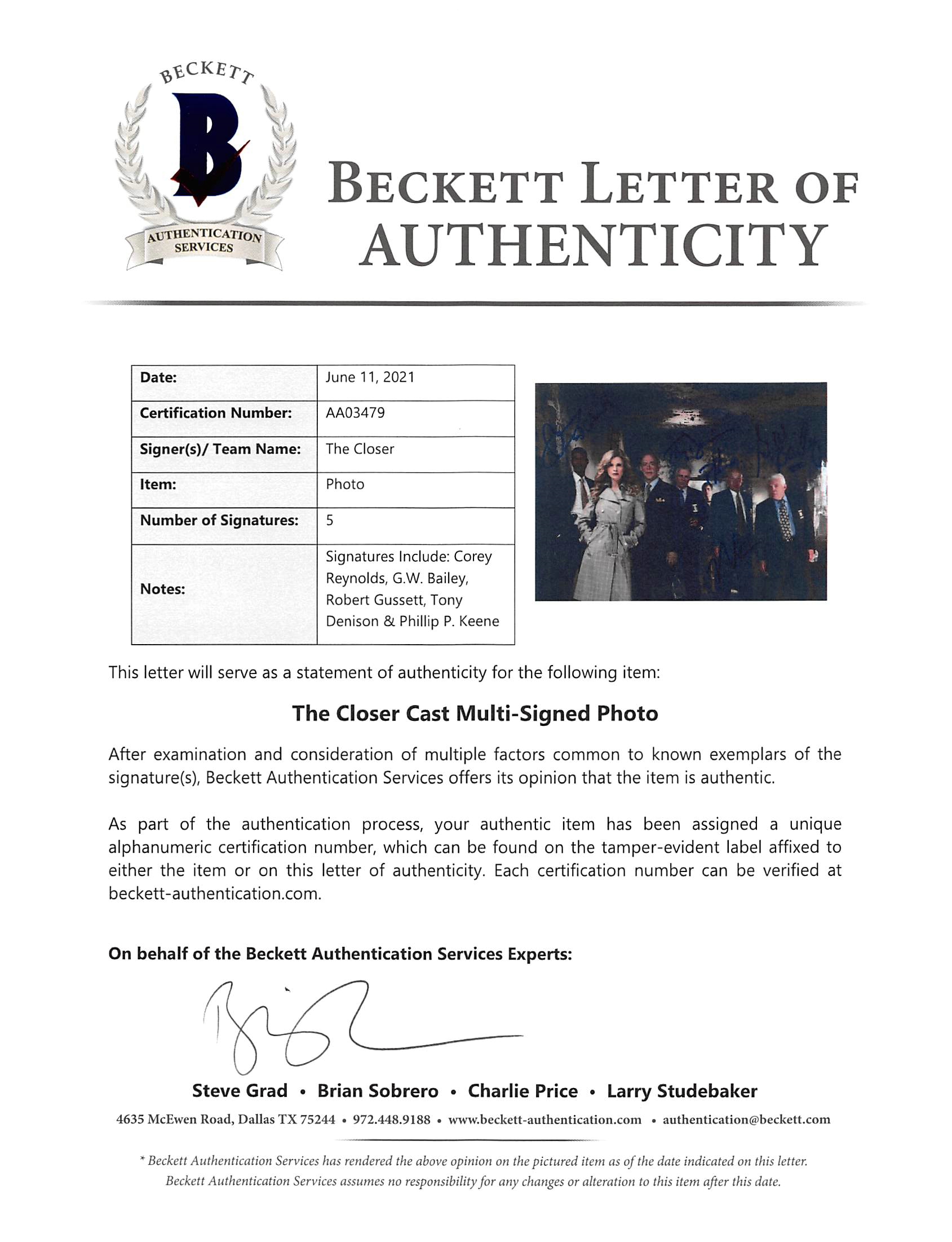 This Autographed 11x14 Photo has been Personally Signed by Corey Reynolds, G.W. Bailey, Robert Gussett, Tony Denison & Phillip P. Keene of The Closer. This item is 100% Authentic to include a Certificate of Authenticity (COA) / hologram by Beckett Authentication Services. The authenticity can be verified on Beckett Authentication Services website.