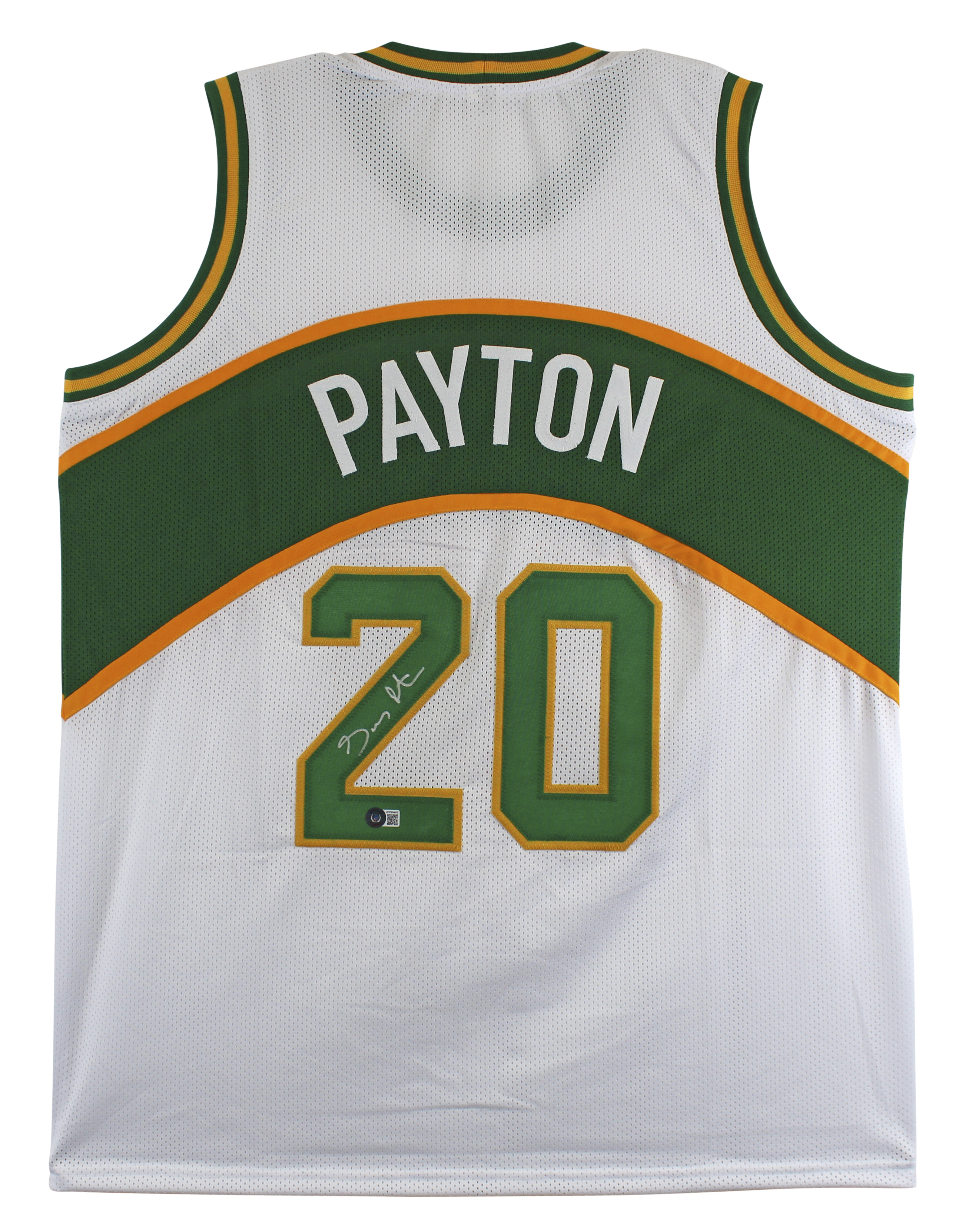 This Autographed Green Pro Style Jersey has been Personally Signed by Gary Payton of the Seattle Supersonics. This item is 100% Authentic to include a hologram by Beckett Authentication Services. This item will come with the new Beckett Authentication hologram that has a scannable QR code rather than the traditional COA. If you would like to have a COA, you are welcome to reach out to Beckett for a printed certification once you receive your item. This is a BAS Witnessed Protection Program item which means a Beckett Authentication Service representative was present when this item was being signed. We conducted an autograph signing with Gary Payton where multiples of the same item were signed. While the photographs are representative of this item, the size, placement and strength of the signature may vary. Each item is hand signed, therefore, each autograph is unique. This item can be verified through BAS Witnessed. This is a X-Large sized, non-branded, custom-stitched Jersey.