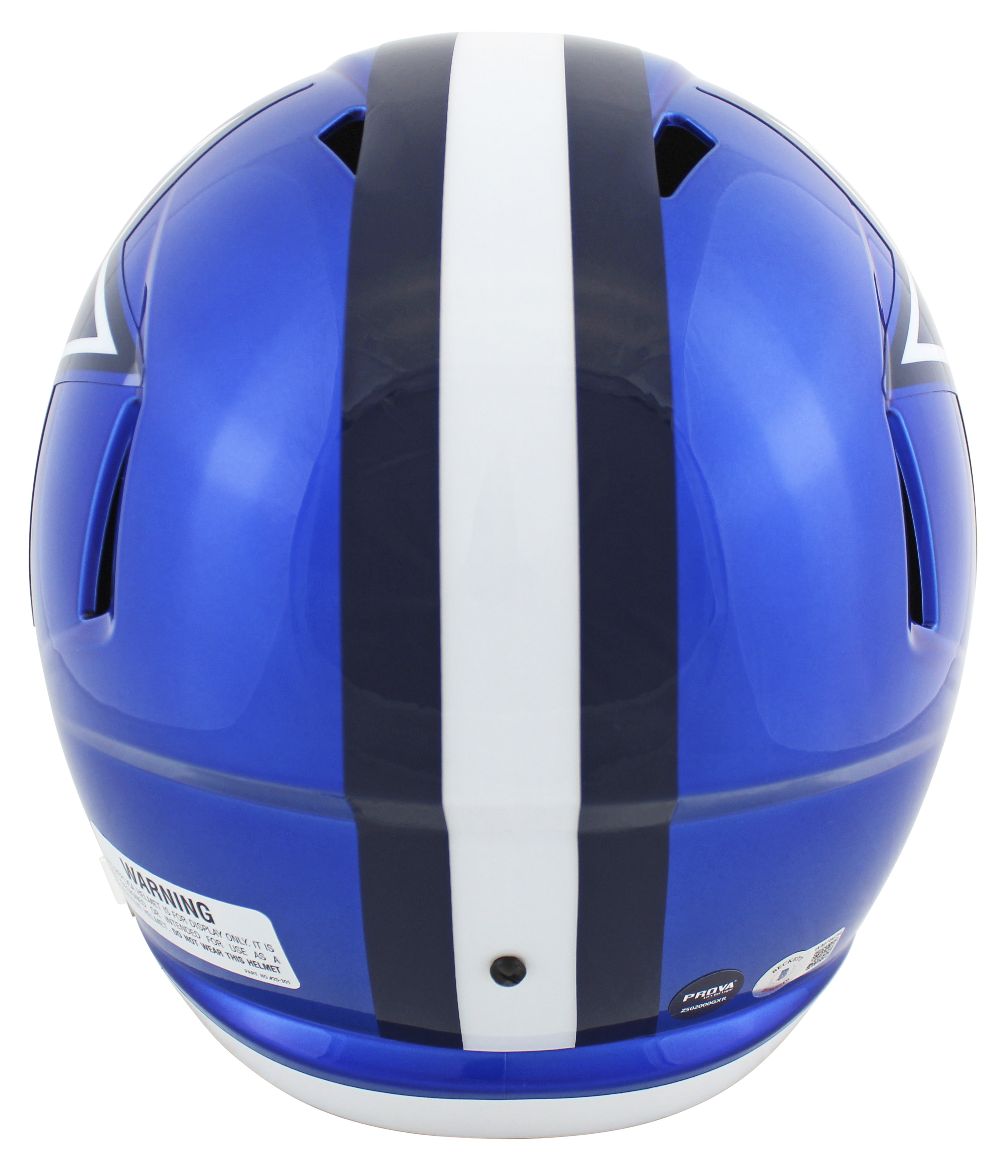 This Autographed Alternate Flash Riddell Full Size Speed Rep Helmet has been Personally Signed by Emmitt Smith of the Dallas Cowboys. This item is 100% Authentic to include a hologram by Beckett Authentication Services. This item will come with the new Beckett Authentication hologram that has a scannable QR code rather than the traditional COA. If you would like to have a COA, you are welcome to reach out to Beckett for a printed certification once you receive your item. This is a BAS Witnessed Protection Program item which means a Beckett Authentication Service representative was present when this item was being signed. This is a stock item. We conducted an autograph signing with Emmitt Smith where multiples of the same item were signed. While the photographs are representative of this item, the size, placement and strength of the signature may vary. Each item is hand signed, therefore, each autograph is unique. This item can be verified through Beckett Witnessed.