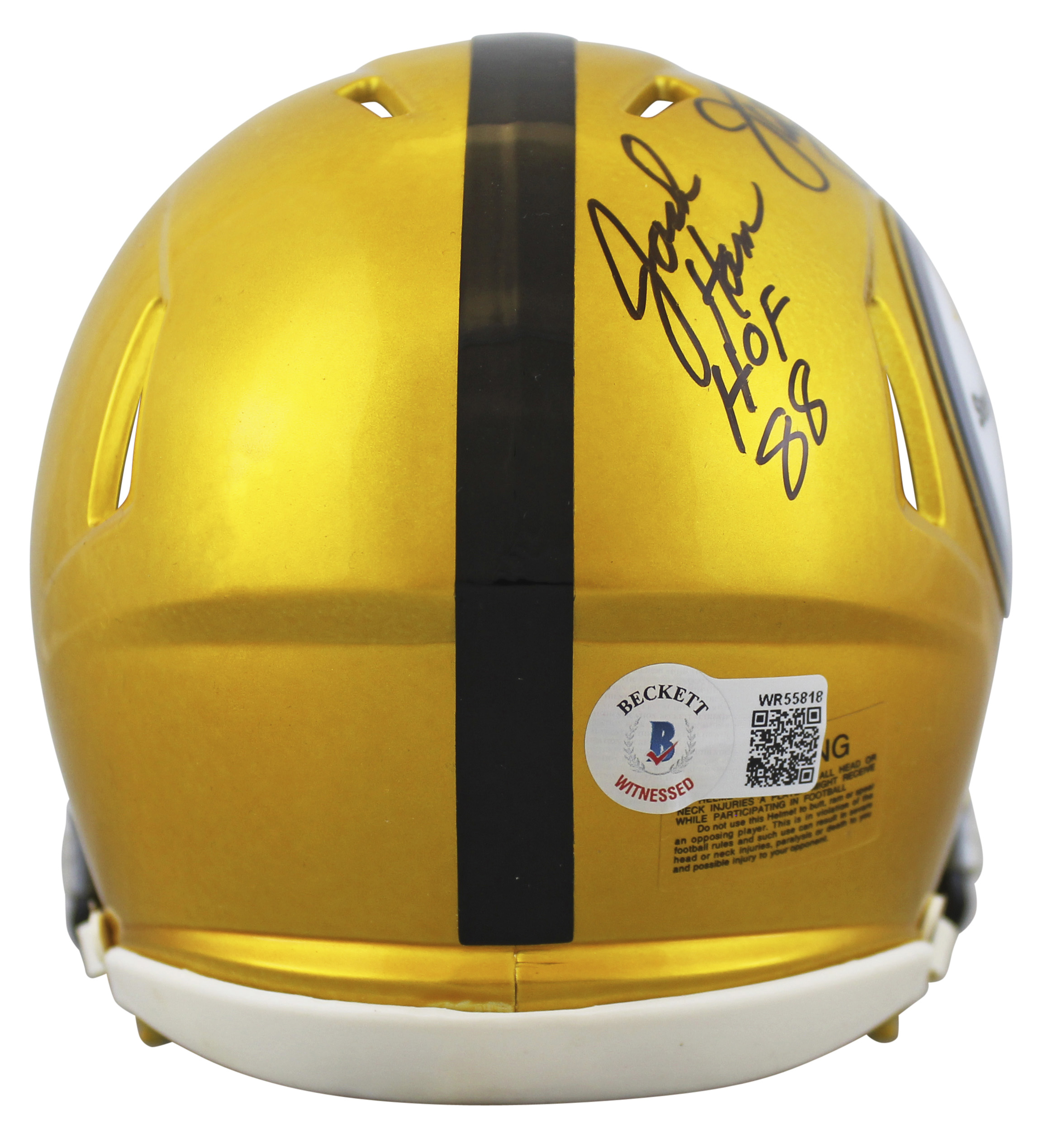 This Autographed Alternate Flash Speed Mini Helmet with the inscription of "2x SB Champs (Russell), HOF 88 (Ham), HOF 90 (Lambert)" has been Personally Signed by Jack Lambert, Jack Ham & Andy Russell of the Pittsburgh Steelers. This item is 100% Authentic to include a hologram by Beckett Authentication Services. This item will come with the new Beckett Authentication hologram that has a scannable QR code rather than the traditional COA. If you would like to have a COA, you are welcome to reach out to Beckett for a printed certification once you receive your item. This is a BAS Witnessed Protection Program item which means a Beckett Authentication Service representative was present when this item was being signed. We conducted an autograph signing with Jack Lambert, Jack Ham & Andy Russell where multiples of the same item were signed. While the photographs are representative of this item, the size, placement and strength of the signature may vary. Each item is hand signed, therefore, each autograph is unique. This item can be verified through BAS Witnessed.