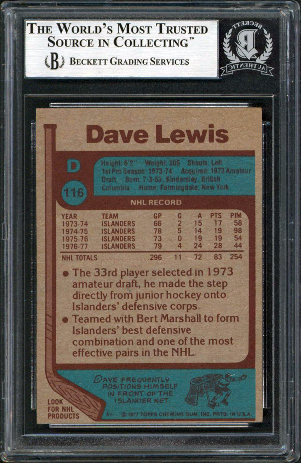 This Autographed 1977 Topps #116 Card has been Personally Signed by Dave Lewis of the New York Islanders. This item is 100% Authentic, it comes slabbed and authenticated by Beckett Authentication Services. The authenticity can be verified on Beckett Authentication Services website.