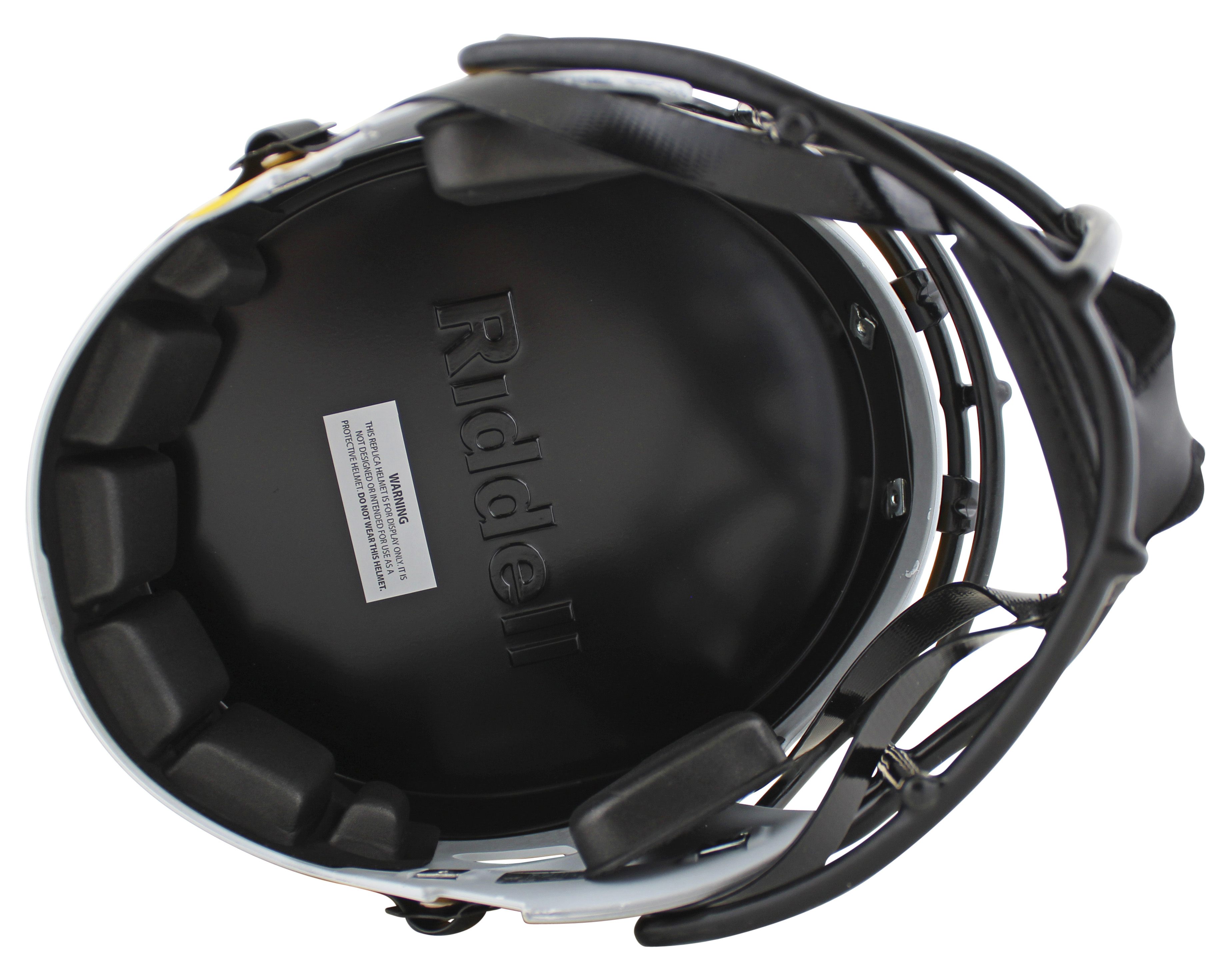 This Autographed Alternate Lunar Riddell Full Size Speed Rep Helmet has been Personally Signed by Marshall Faulk of the Los Angeles Rams. This item is 100% Authentic to include a hologram by Beckett Authentication Services. This item will come with the new Beckett Authentication hologram that has a scannable QR code rather than the traditional COA. If you would like to have a COA, you are welcome to reach out to Beckett for a printed certification once you receive your item. This is a BAS Witnessed Protection Program item which means a Beckett Authentication Service representative was present when this item was being signed. We conducted an autograph signing with Marshall Faulk where multiples of the same item were signed. While the photographs are representative of this item, the size, placement and strength of the signature may vary. Each item is hand signed, therefore, each autograph is unique. This item can be verified through BAS Witnessed.