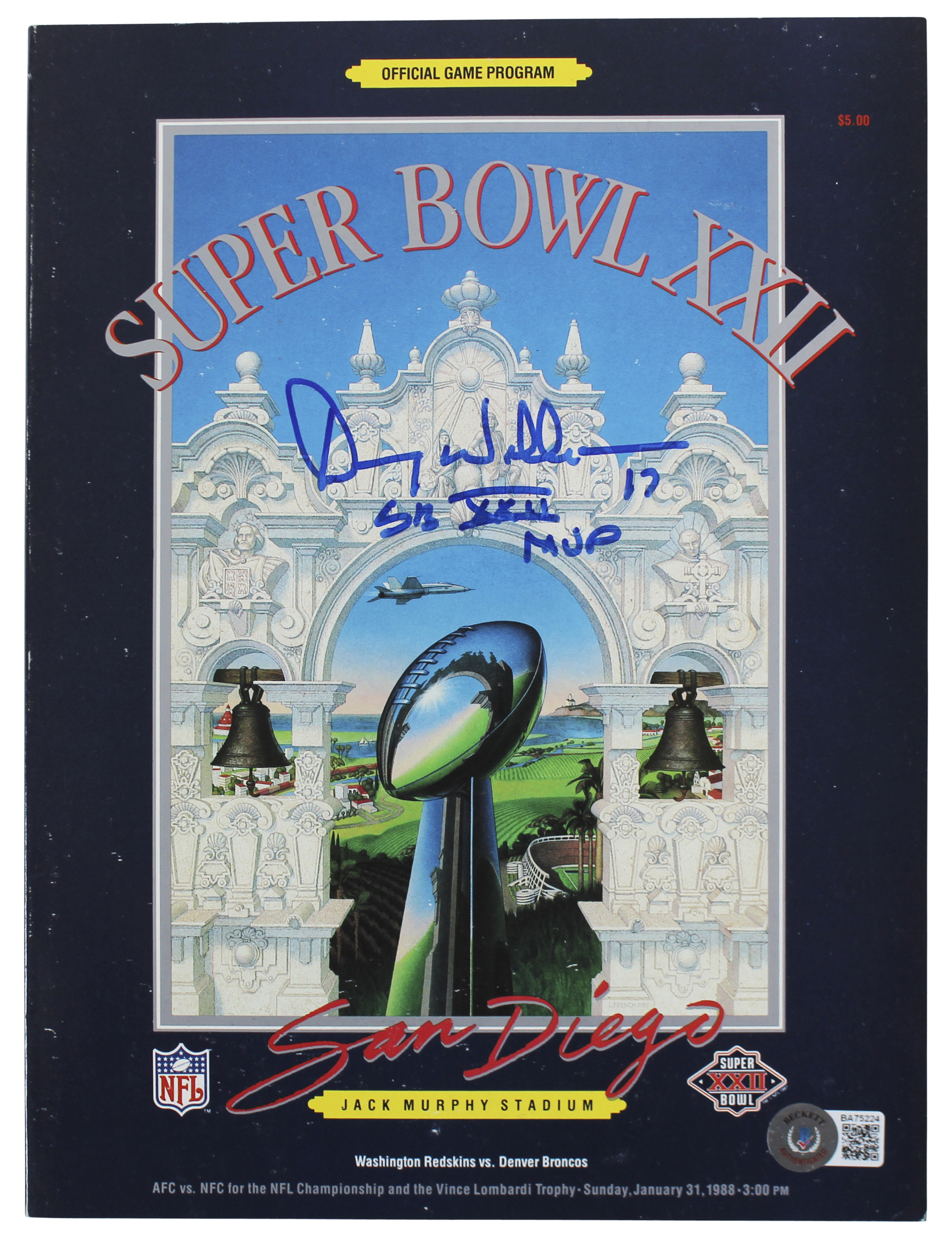 This Autographed Super Bowl XXII Program with the inscription of "SB XXII MVP" has been Personally Signed by Doug Williams of the Washington Football Team. This item is 100% Authentic to include a Certificate of Authenticity (COA) / hologram by Beckett Authentication Services. The authenticity can be verified on Beckett Authentication Services website.