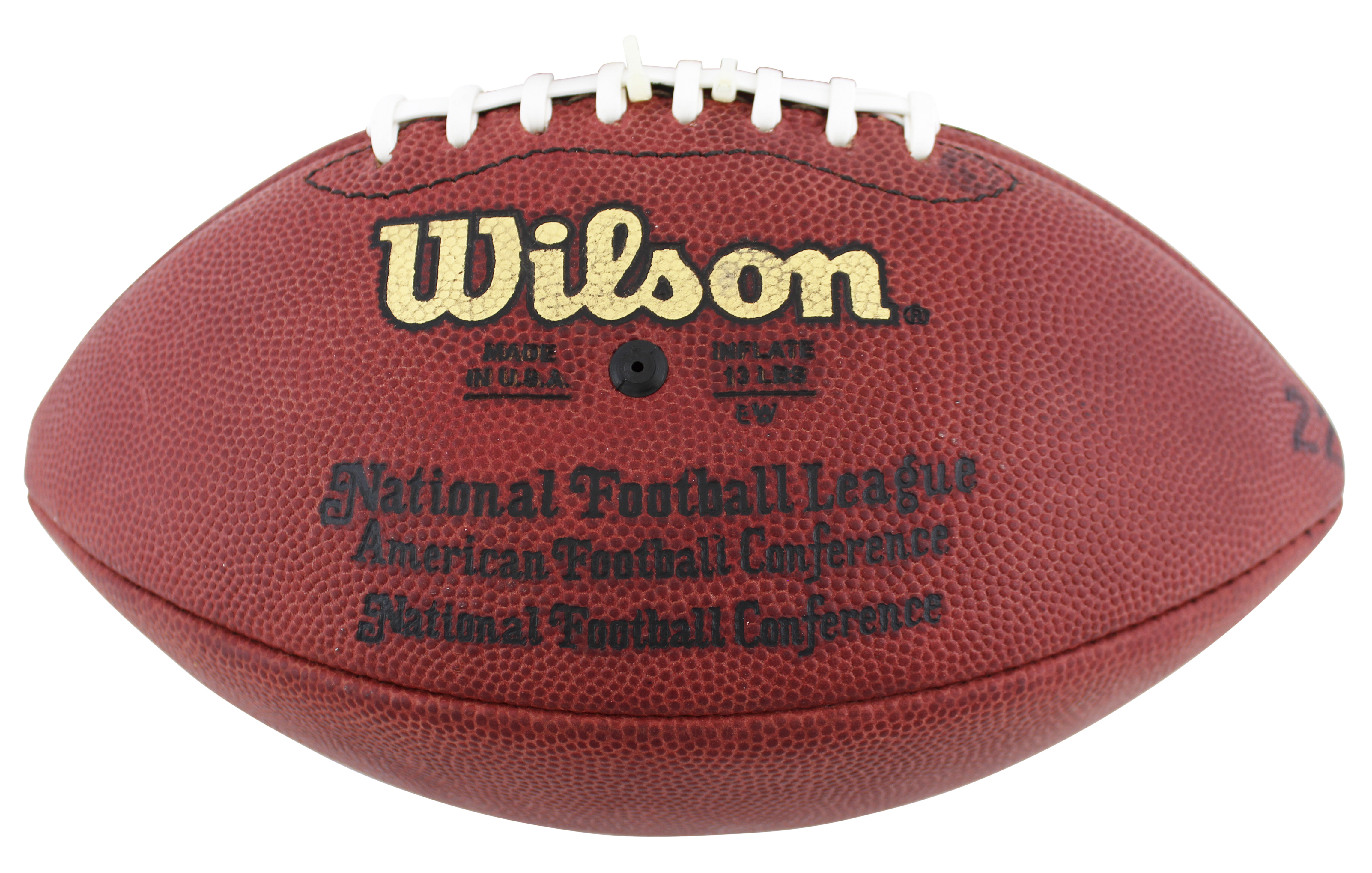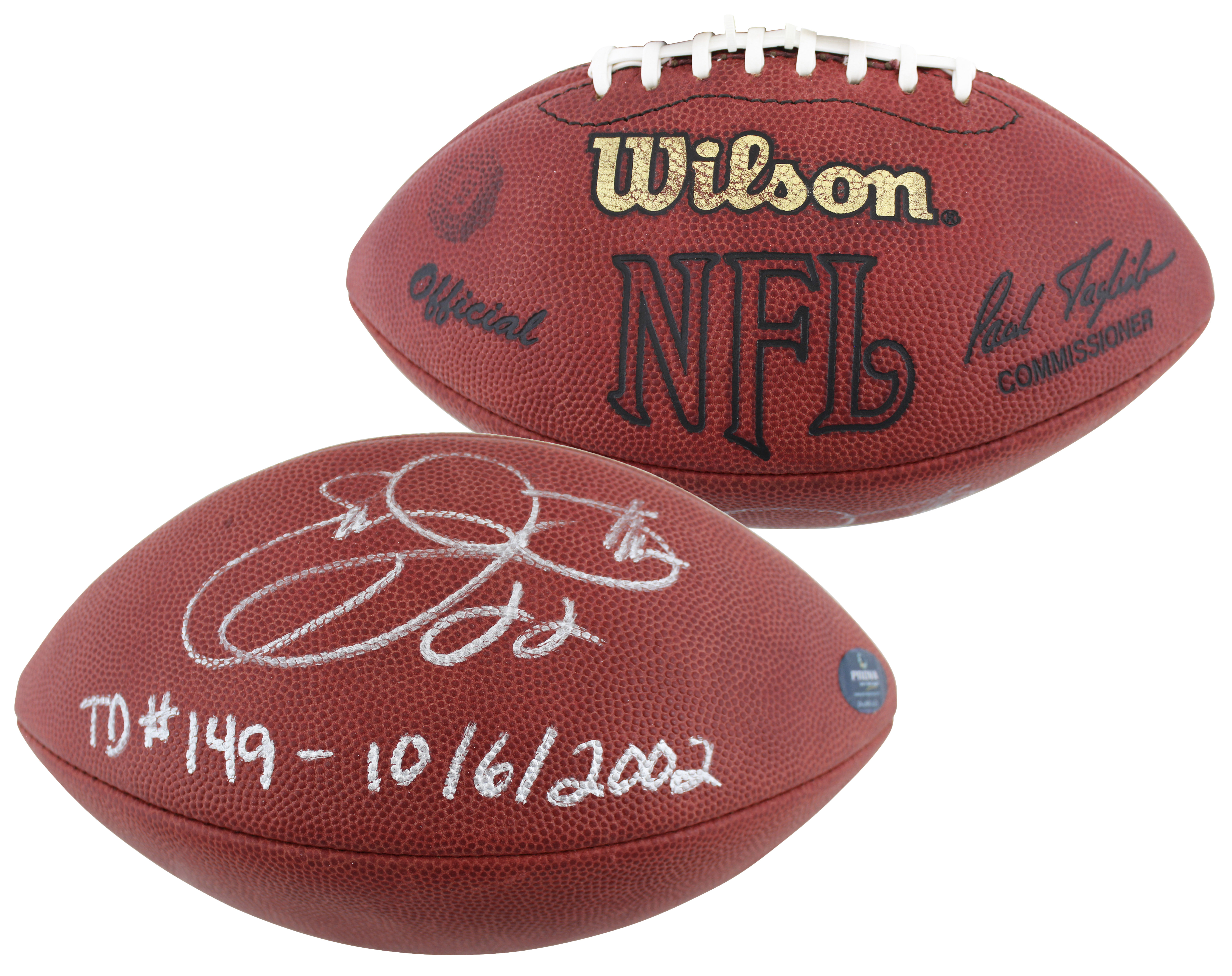 This Autographed Game Used Wilson "The Duke" Nfl Football with the inscription of "TD #149 - 10/6/2002" has been Personally Signed by Emmitt Smith of the Dallas Cowboys. This item is 100% Authentic to include a Certificate of Authenticity (COA) / hologram by Beckett Authentication Services. The authenticity can be verified on Beckett Authentication Services website.