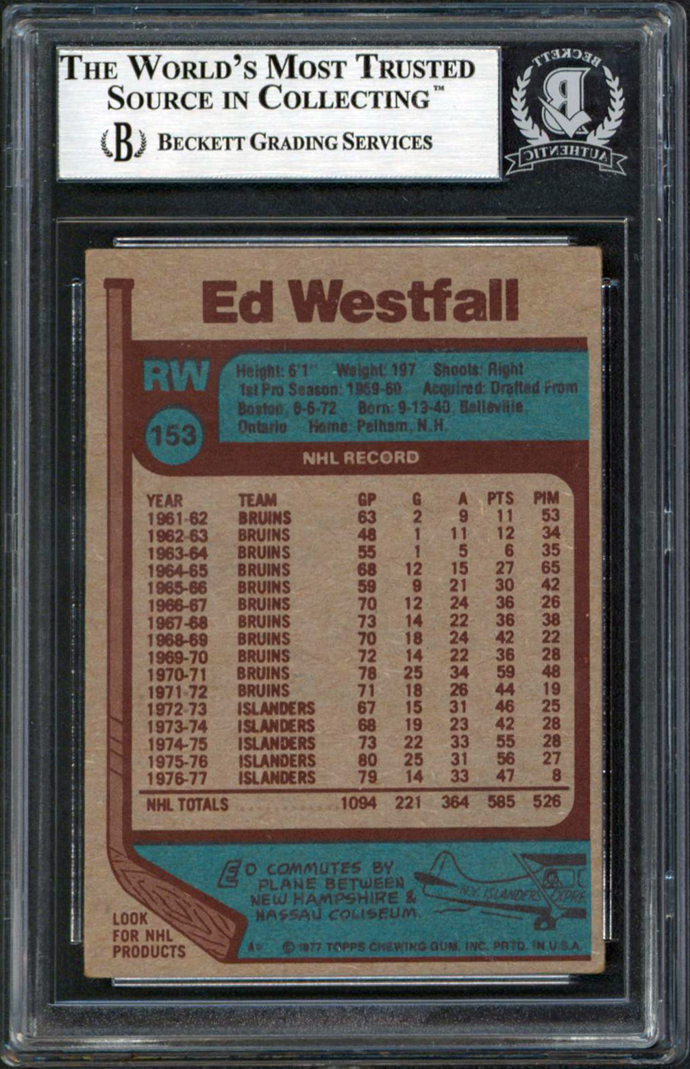 This Autographed 1977 Topps #153 Card has been Personally Signed by Ed Westfall of the New York Islanders. This item is 100% Authentic, it comes slabbed and authenticated by Beckett Authentication Services. The authenticity can be verified on Beckett Authentication Services website.