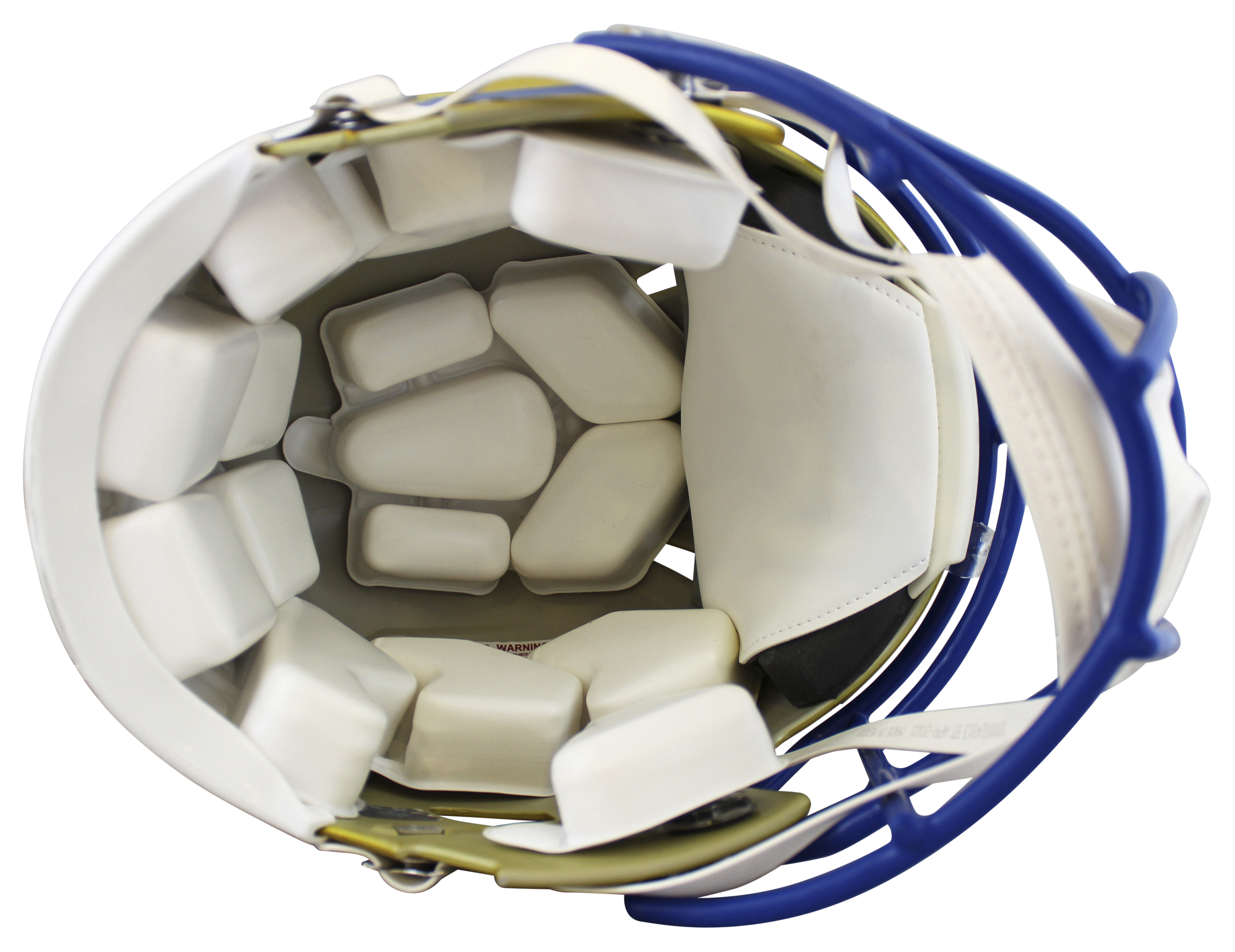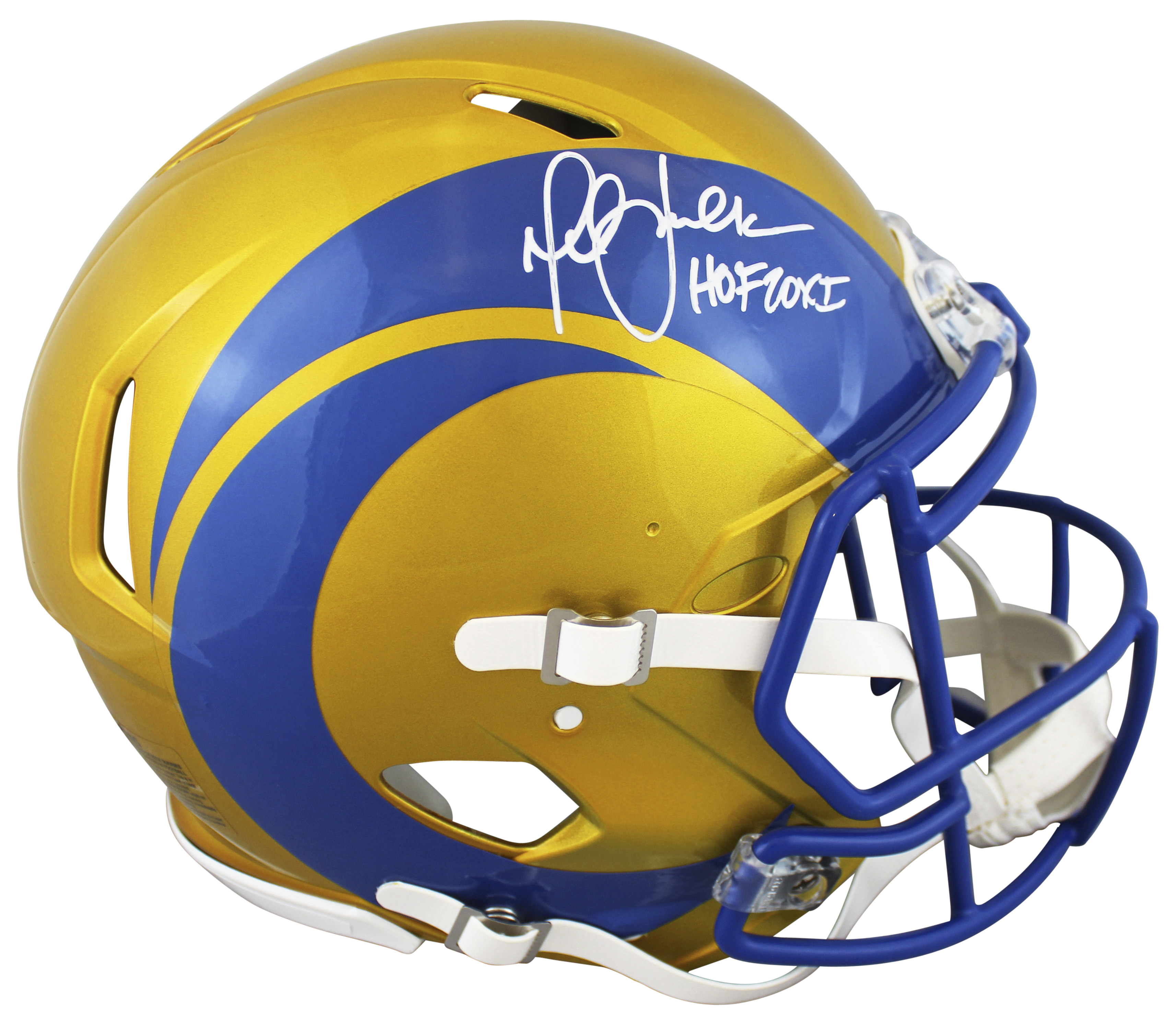 This Autographed Alternate Flash Riddell Authentic Full Size Speed Proline Helmet with the inscription of "HOF 20XI" has been Personally Signed by Marshall Faulk of the St. Louis Rams. This item is 100% Authentic to include a Certificate of Authenticity (COA) / hologram by Beckett Authentication Services. This is a BAS Witnessed Protection Program item which means a Beckett Authentication Service representative was present when this item was being signed. We conducted an autograph signing with Marshall Faulk where multiples of the same item were signed. While the photographs are representative of this item, the size, placement and strength of the signature may vary. Each item is hand signed, therefore, each autograph is unique. This item can be verified through BAS Witnessed.