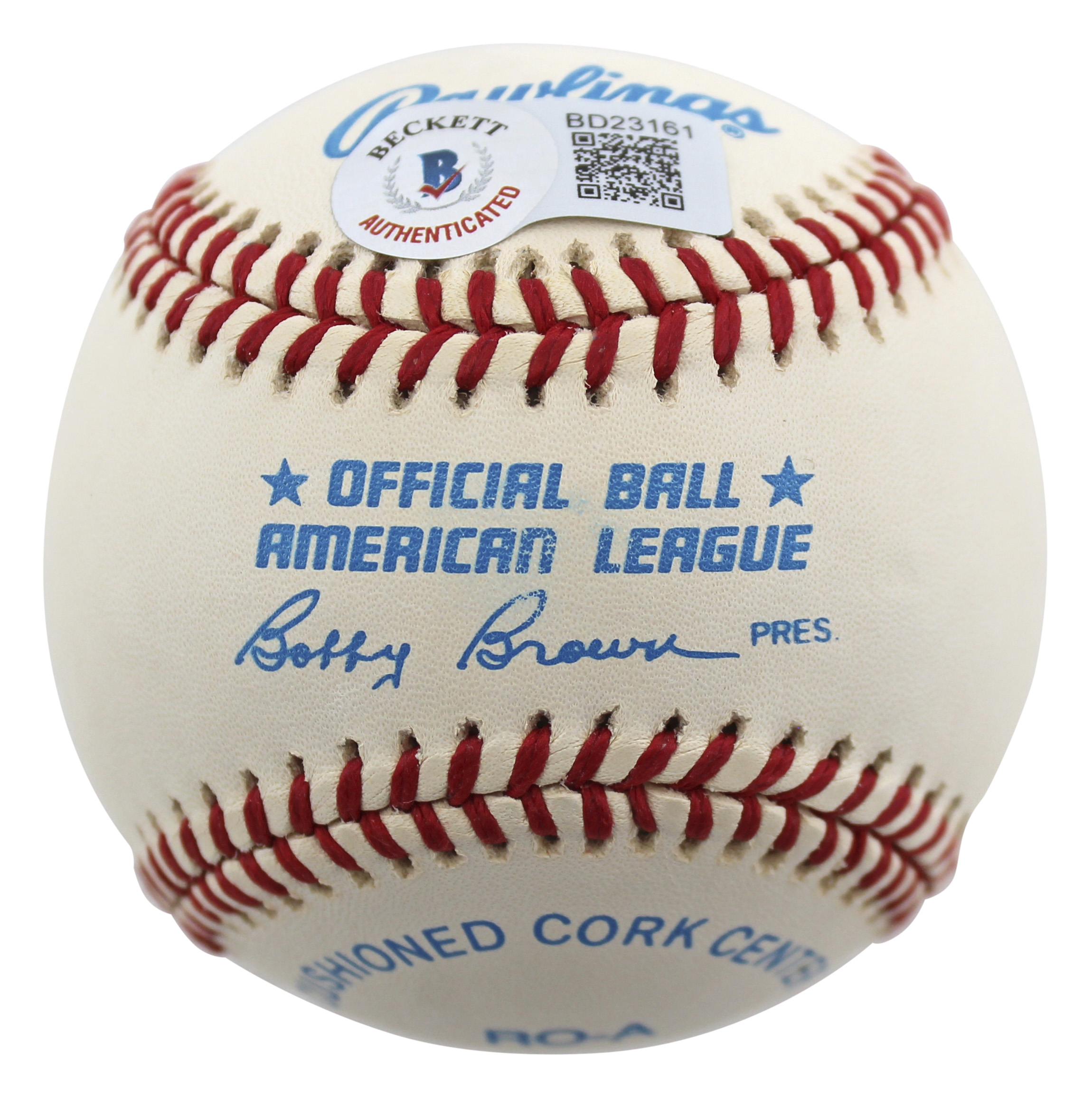 This Autographed Bobby Brown Oal Baseball has been Personally Signed by Mike Davis of the Oakland Athletics. This item is 100% Authentic. This item may come with the new Beckett Authentication hologram that has a scannable QR code rather than the traditional COA. If you would like to have a COA, you are welcome to reach out to Beckett for a printed certification once you receive your item. We have multiples of this same item. While the photographs are representative of this item, the size, placement and strength of the signature may vary. Each item is hand signed, therefore, each autograph is unique. Please know, these are vintage baseballs, and will have some spotting and toning throughout. Please reach out to us with questions prior to purchase.