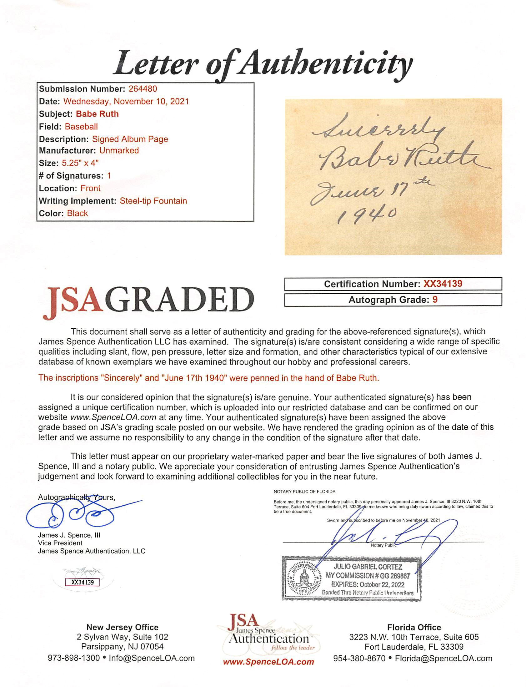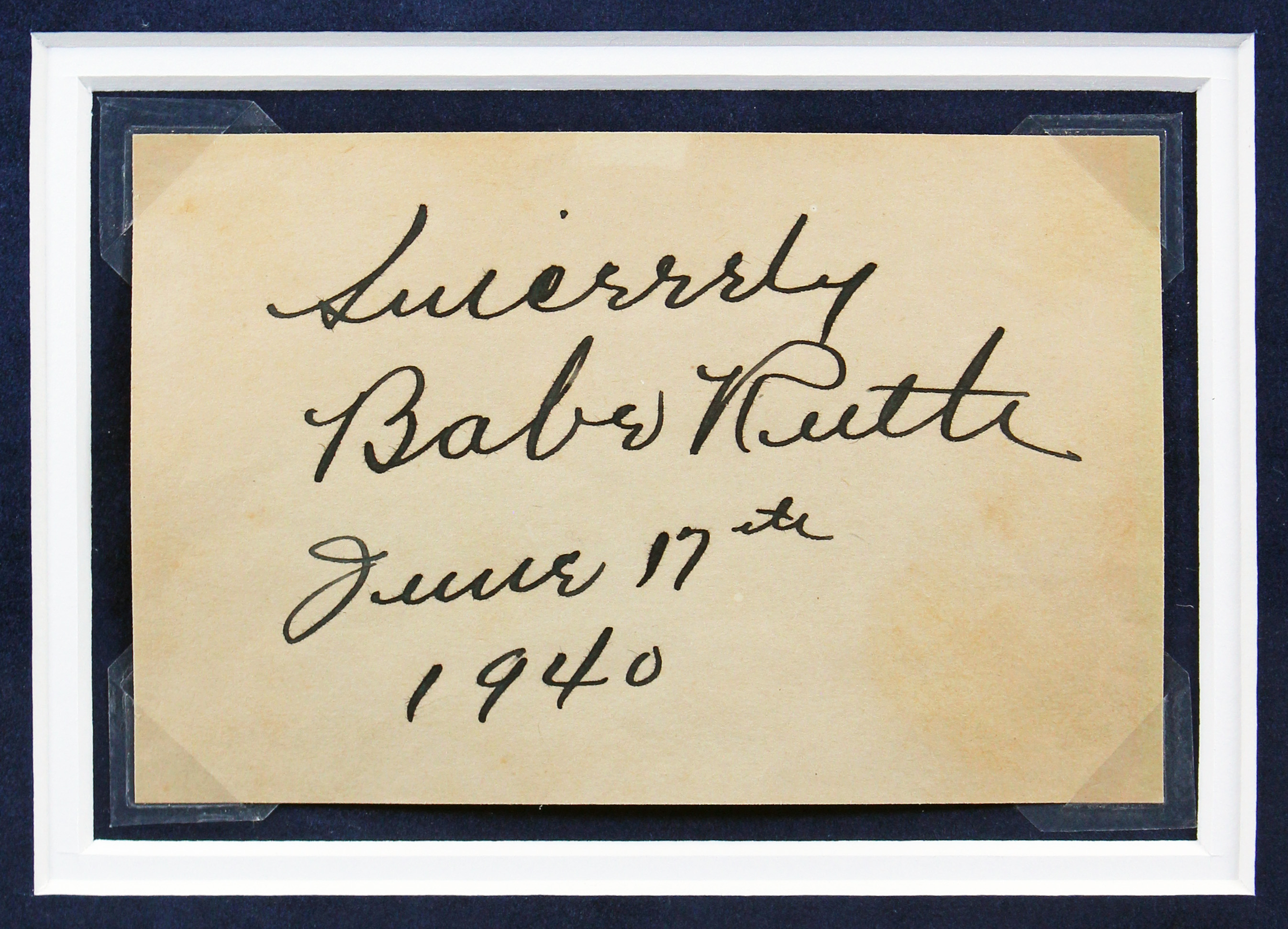 This Autographed Auto Graded Mint 9! & Framed 3x4.25 Cut Signature with the inscription of "Sincerely, June 17th 1940" has been Personally Signed by Babe Ruth of the New York Yankees. This item is 100% Authentic and comes with a PSA/DNA Certification Card and a matching numbered Hologram. The authenticity can be verified on Professional Sports Authenticator website. This item has been professionally framed to overall dimensions of approximately 35.5 x 36.5 inches.