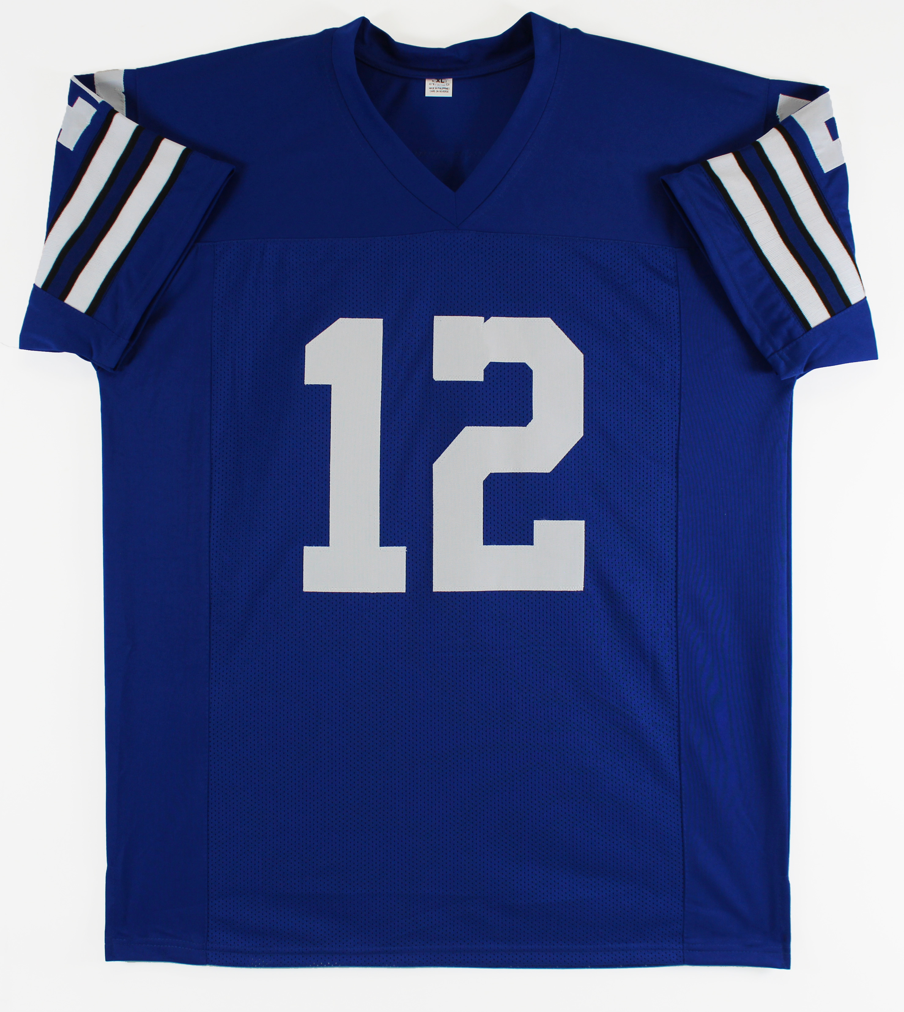 This Autographed Blue Throwback Pro Style Jersey has been Personally Signed by Roger Staubach of the Dallas Cowboys. This item is 100% Authentic to include a hologram by Beckett Authentication Services. This item will come with the new Beckett Authentication hologram that has a scannable QR code rather than the traditional COA. If you would like to have a COA, you are welcome to reach out to Beckett for a printed certification once you receive your item. This is a BAS Witnessed Protection Program item which means a Beckett Authentication Service representative was present when this item was being signed. We conducted an autograph signing with Roger Staubach where multiples of the same item were signed. While the photographs are representative of this item, the size, placement and strength of the signature may vary. Each item is hand signed, therefore, each autograph is unique. This item can be verified through BAS Witnessed. This is a X-Large sized, non-branded, custom-stitched Jersey.