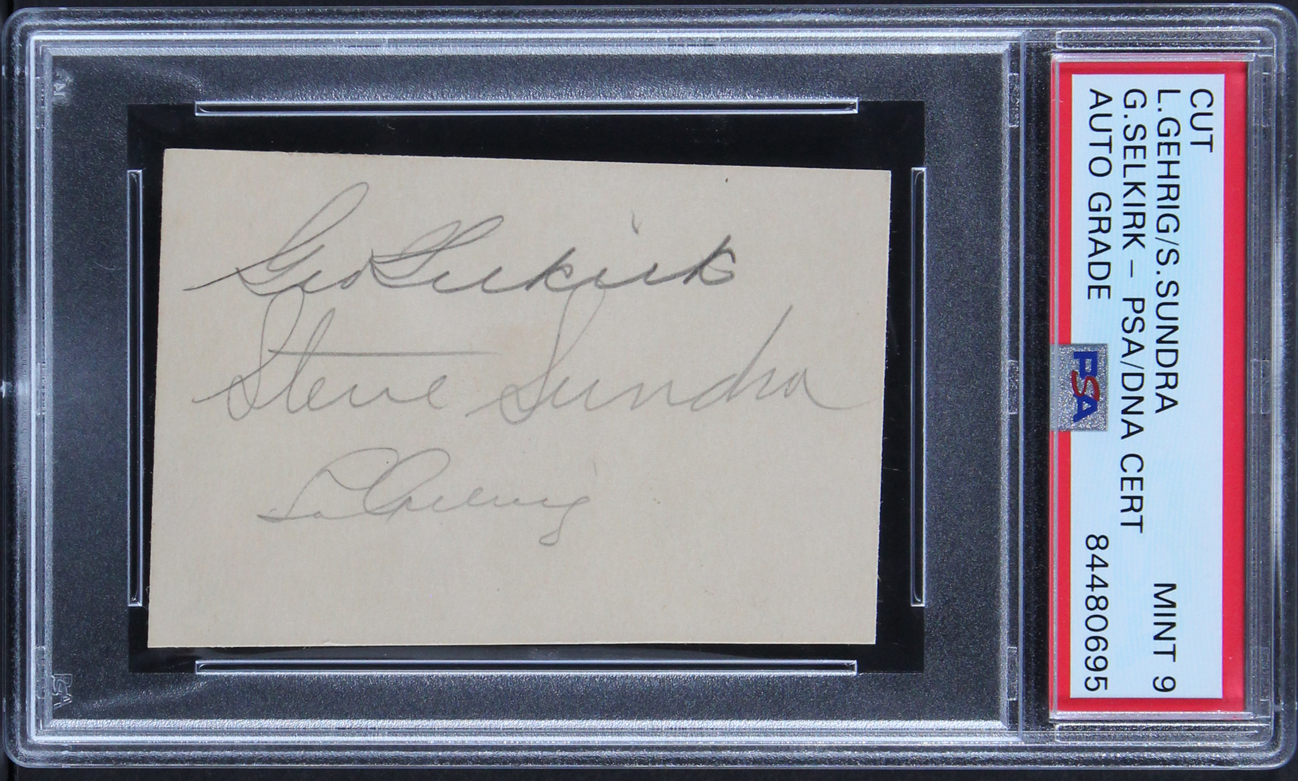 This Autographed Auto Graded Mint 9! 2x3 Cut Signature has been Personally Signed by Lou Gehrig, George Selkirk & Steve Sundra of the New York Yankees. This item is 100% Authentic, it comes slabbed and authenticated by PSA/DNA. The authenticity can be verified on Professional Sports Authenticator website.