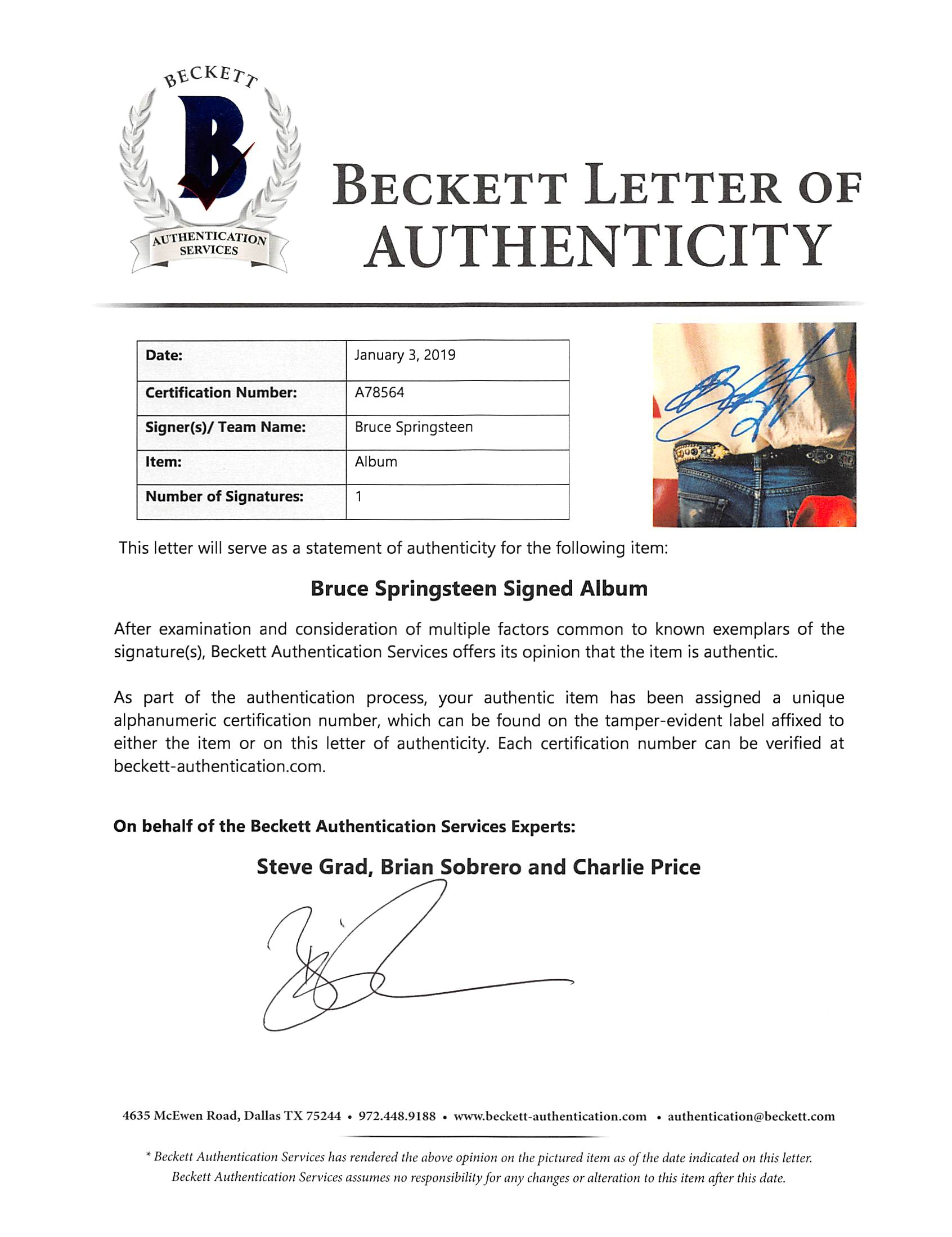 This Autographed Born In The USA Album Cover W/ Vinyl has been Personally Signed by Bruce Springsteen. This item is 100% Authentic to include a Certificate of Authenticity (COA) / hologram by Beckett Authentication Services. The authenticity can be verified on Beckett Authentication Services website. Please refer to photos for condition prior to purchase. Press Pass Collectibles only offers Authentic Autographs by Bruce Springsteen through Signings, In-Person Signings or Private Collections to include a 100% money back Lifetime Authenticity Guarantee.
