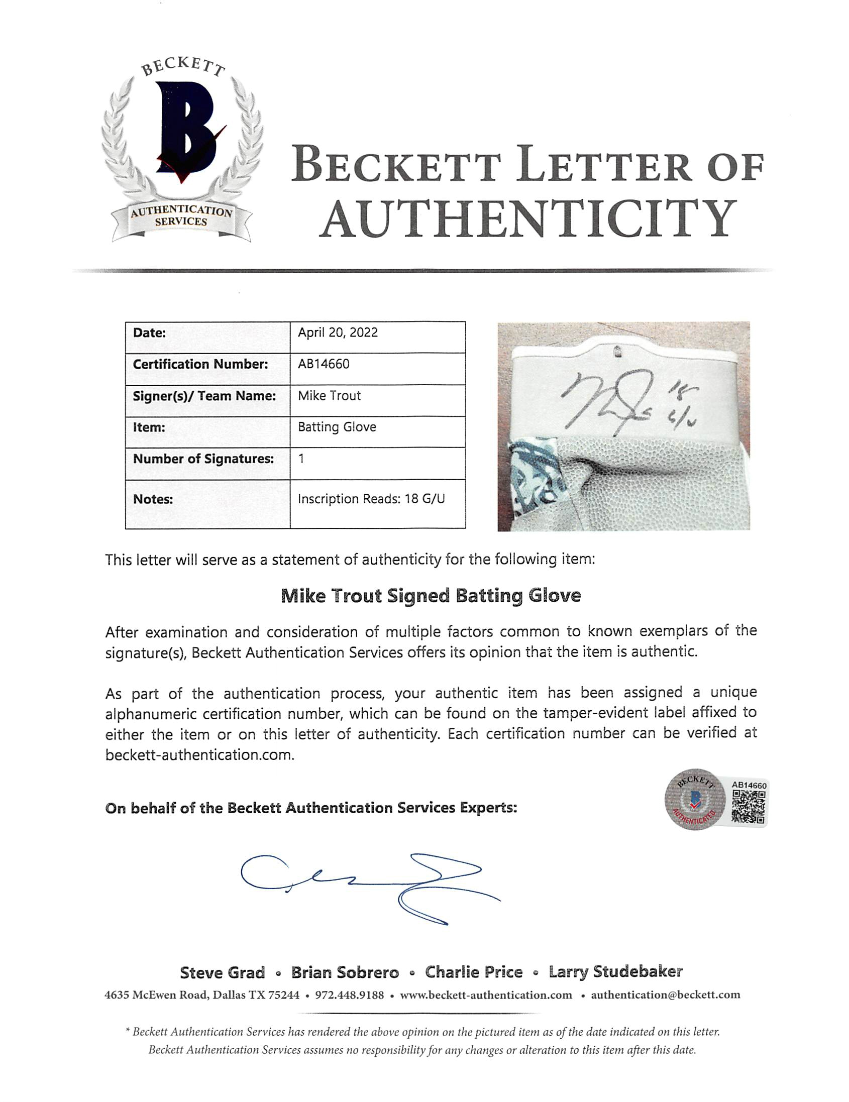 This Autographed 2018 Game Used Nike Batting Glove with the inscription of "18 G/U" has been Personally Signed by Mike Trout of the Los Angeles Angels. This item is 100% Authentic to include a hologram by Beckett Authentication Services. This item may come with the new Beckett Authentication hologram that has a scannable QR code rather than the traditional COA. If you would like to have a COA, you are welcome to reach out to Beckett for a printed certification once you receive your item. The authenticity can be verified on Beckett Authentication Services website.