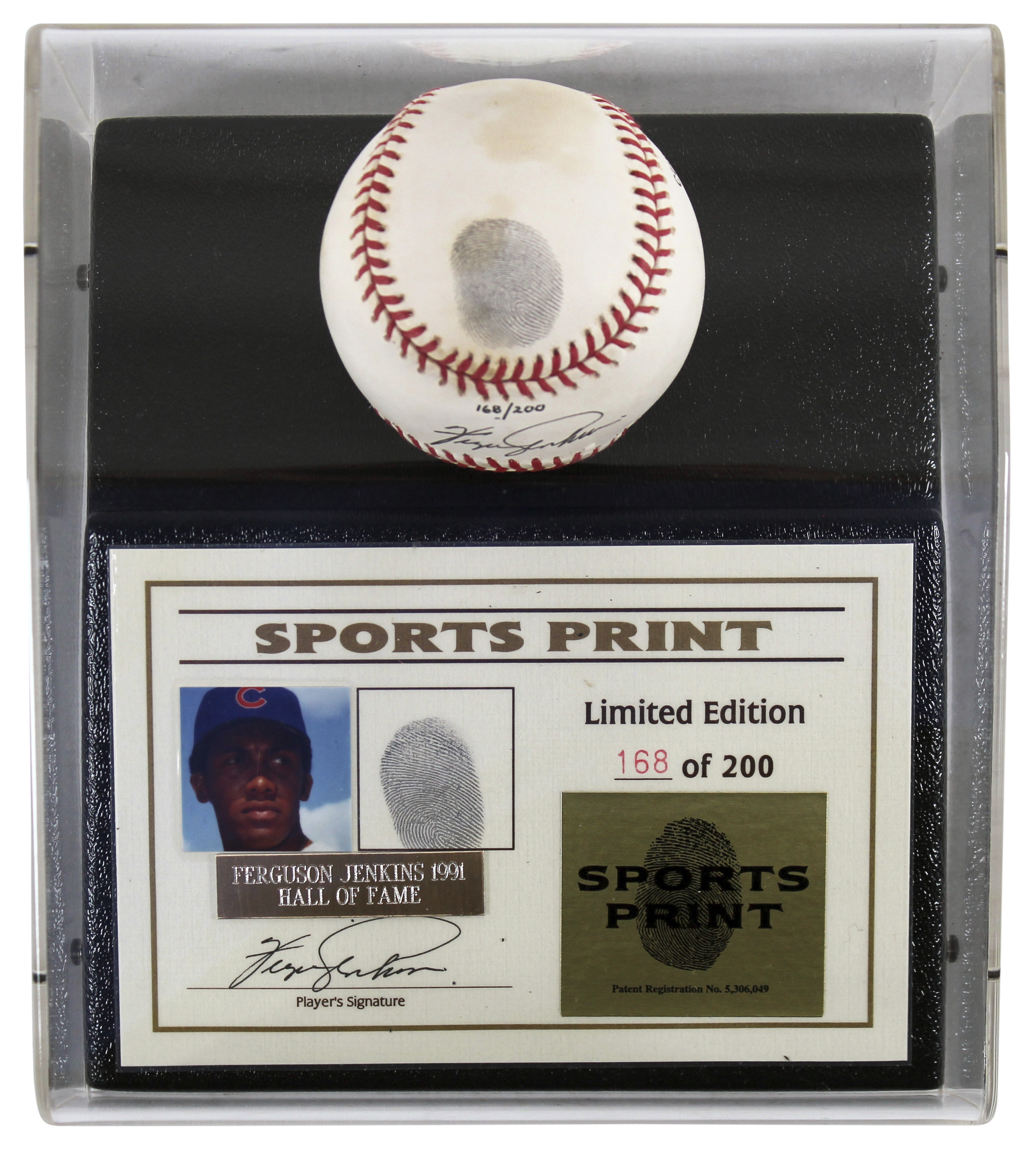 This Autographed Limited Edition Numbered To 200 w/ Display Case Thumbprint Onl Baseball has been Personally Signed by Fergie Jenkins of the Chicago Cubs. This item is 100% Authentic to include a Certificate of Authenticity (COA) / hologram by Beckett Authentication Services. We have multiples of this same item. While the photographs are representative of this item, the size, placement and strength of the signature may vary. Each item is hand signed, therefore, each autograph is unique. Each ball has a thumbprint of Fergie Jenkins , the photo in the case is also signed and has Fergie Jenkins signature, though the Beckett COA does not cover both signatures. These vintage balls all have some varying degrees of spotting and toning. We are not able to guarantee the coloring of the ball, and the number of the edition you may receive.