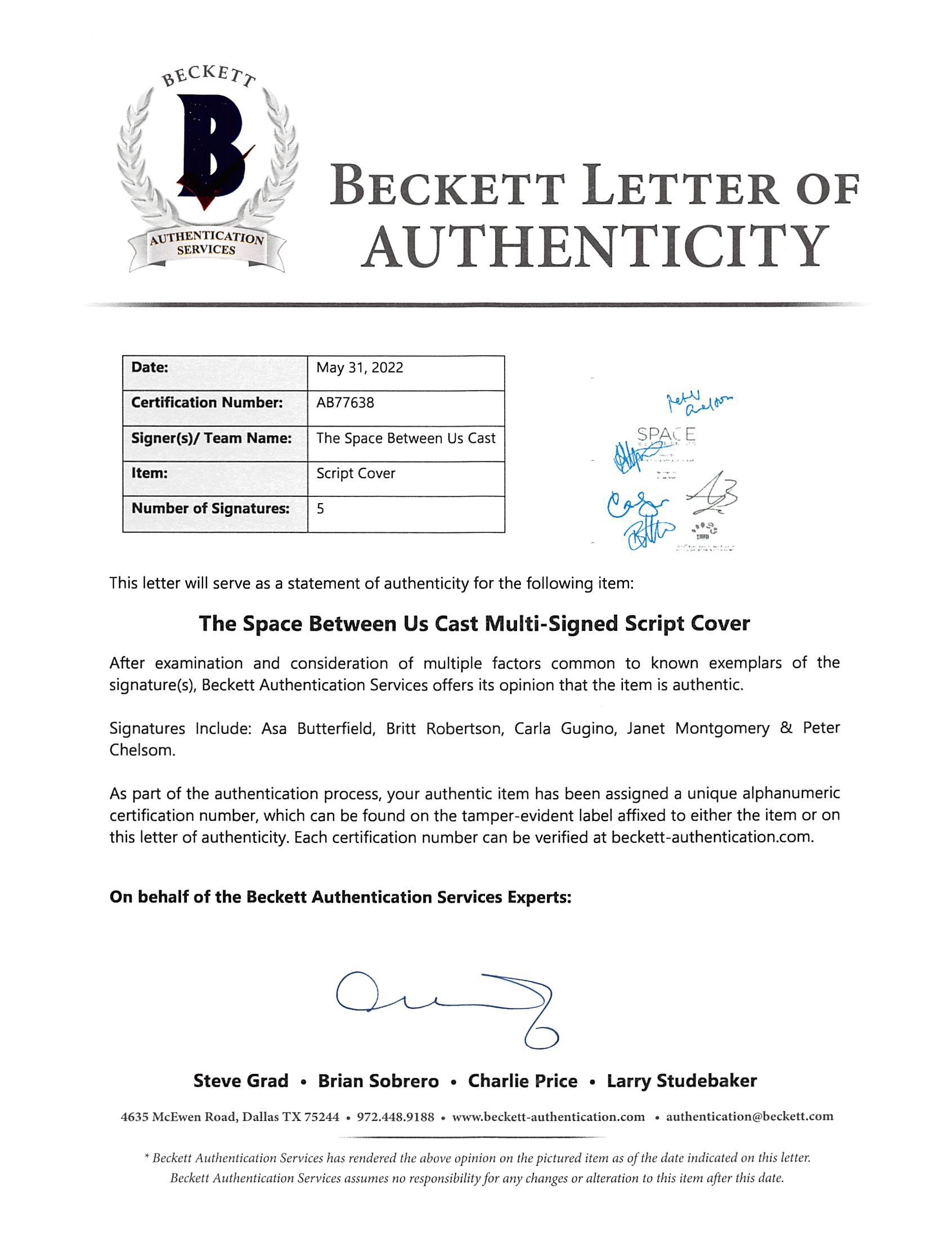 This Autographed The Space Between Us 8.5x11 Script Cover has been Personally Signed by Asa Butterfield, Britt Robertson, Carla Gugino, Janet Montgomery & Peter Chelsom of The Space Between Us. This item is 100% Authentic to include a Certificate of Authenticity (COA) / hologram by Beckett Authentication Services. The authenticity can be verified on Beckett Authentication Services website.