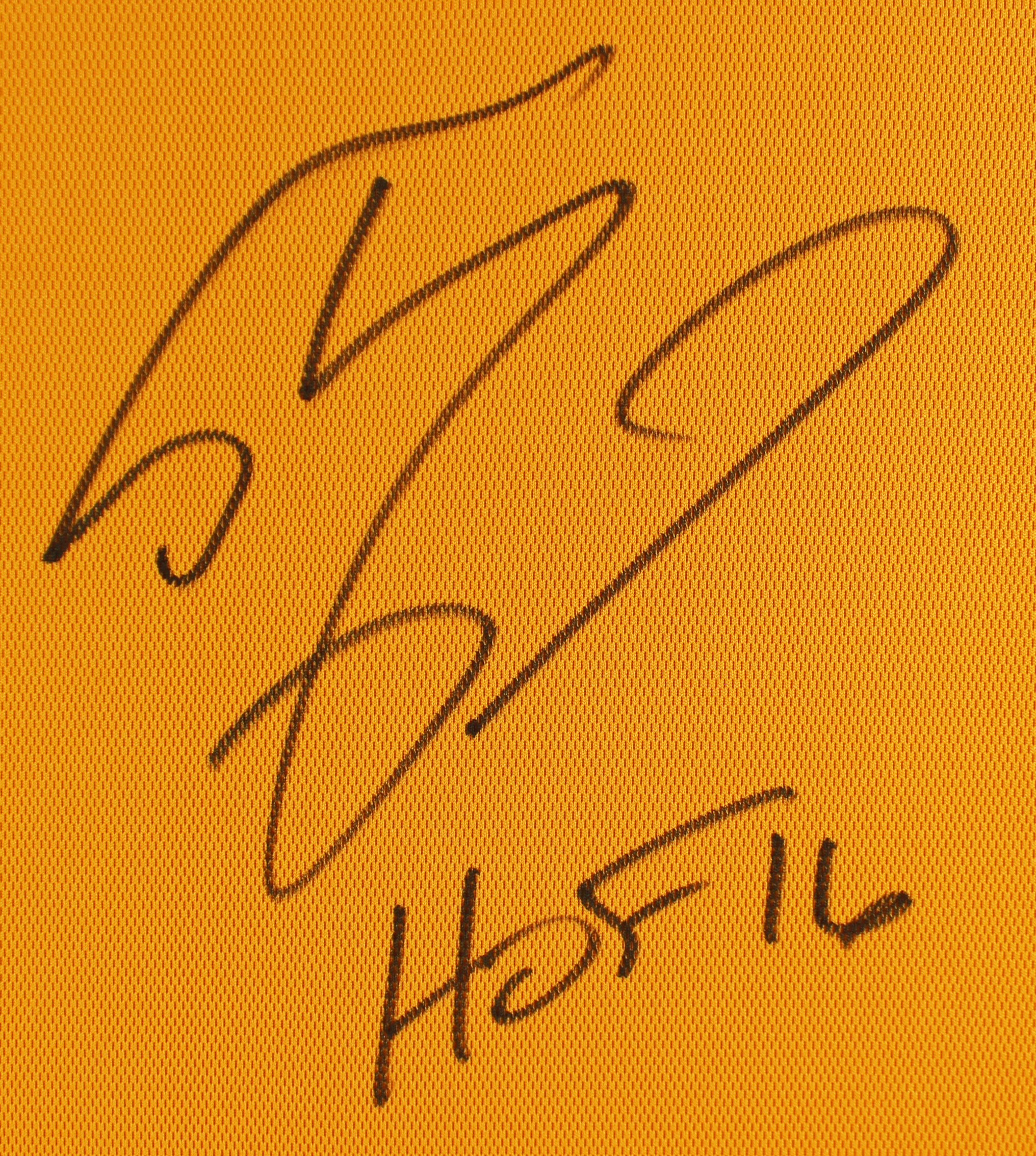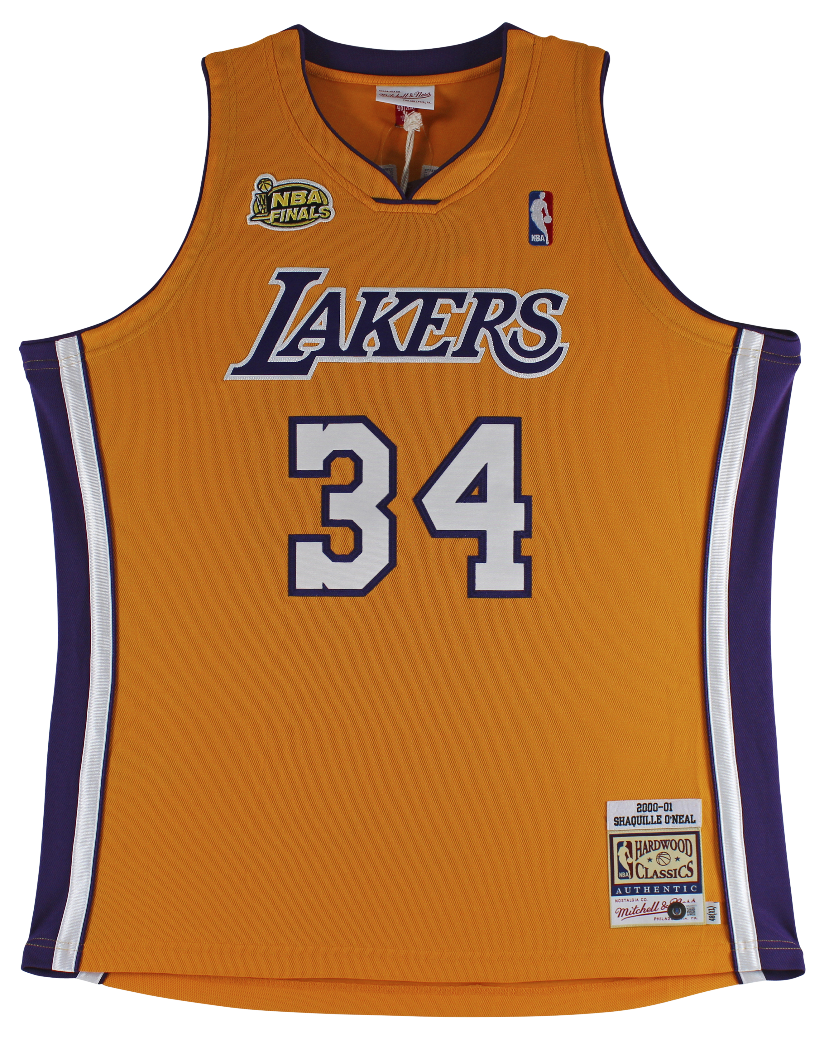 This Autographed Yellow Mitchell & Ness 2000-01 Hardwood Classics Authentic Jersey with the inscription of "HOF 16" has been Personally Signed by Shaquille O'Neal of the Los Angeles Lakers. This item is 100% Authentic to include a hologram by Beckett Authentication Services. This item may come with the new Beckett Authentication hologram that has a scannable QR code rather than the traditional COA. If you would like to have a COA, you are welcome to reach out to Beckett for a printed certification once you receive your item. This is a BAS Witnessed Protection Program item which means a Beckett Authentication Service representative was present when this item was being signed. We conducted an autograph signing with Shaquille O'Neal where multiples of the same item were signed. While the photographs are representative of this item, the size, placement and strength of the signature may vary. Each item is hand signed, therefore, each autograph is unique. This item can be verified through BAS Witnessed. This is a X-Large sized Jersey.