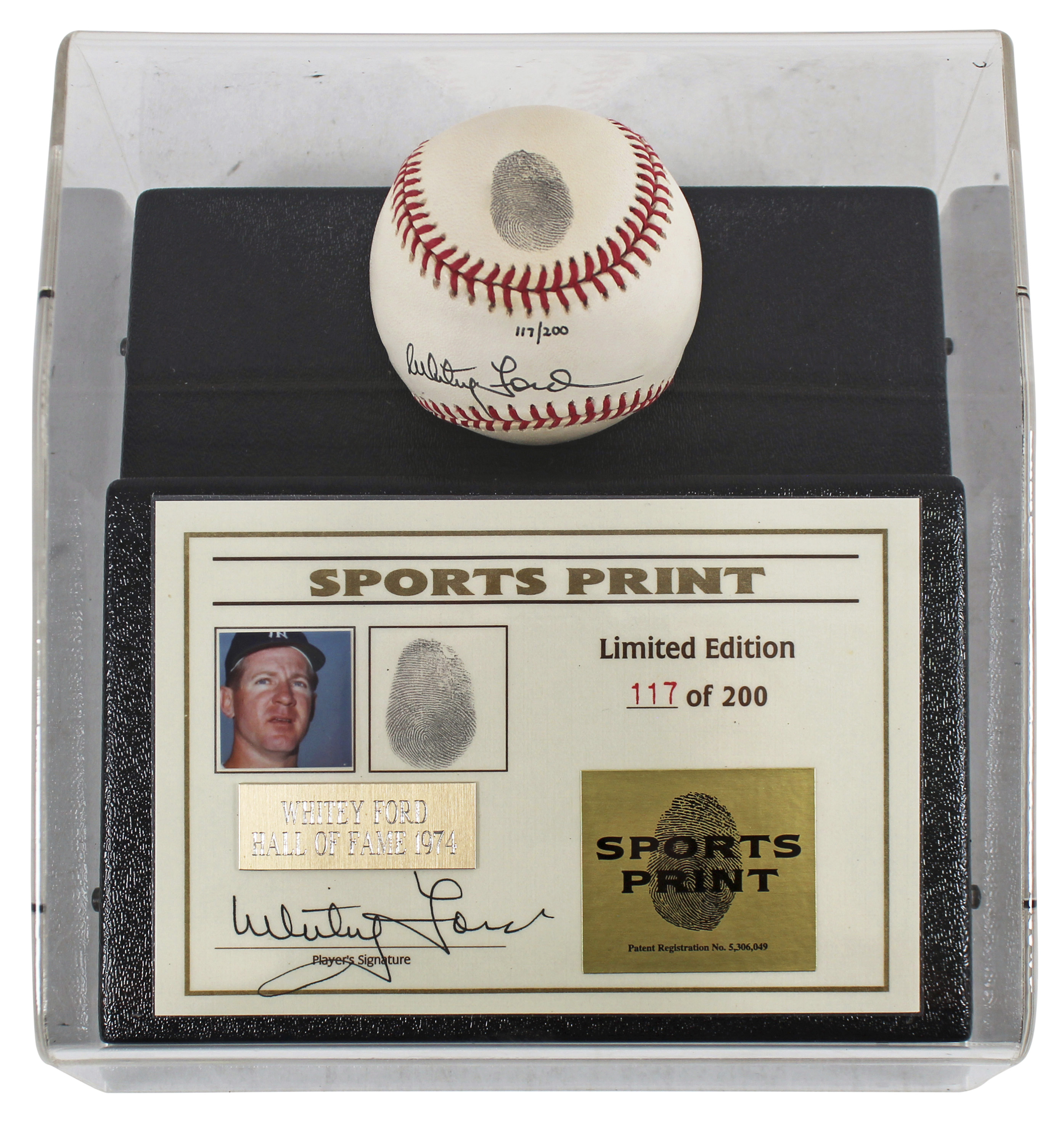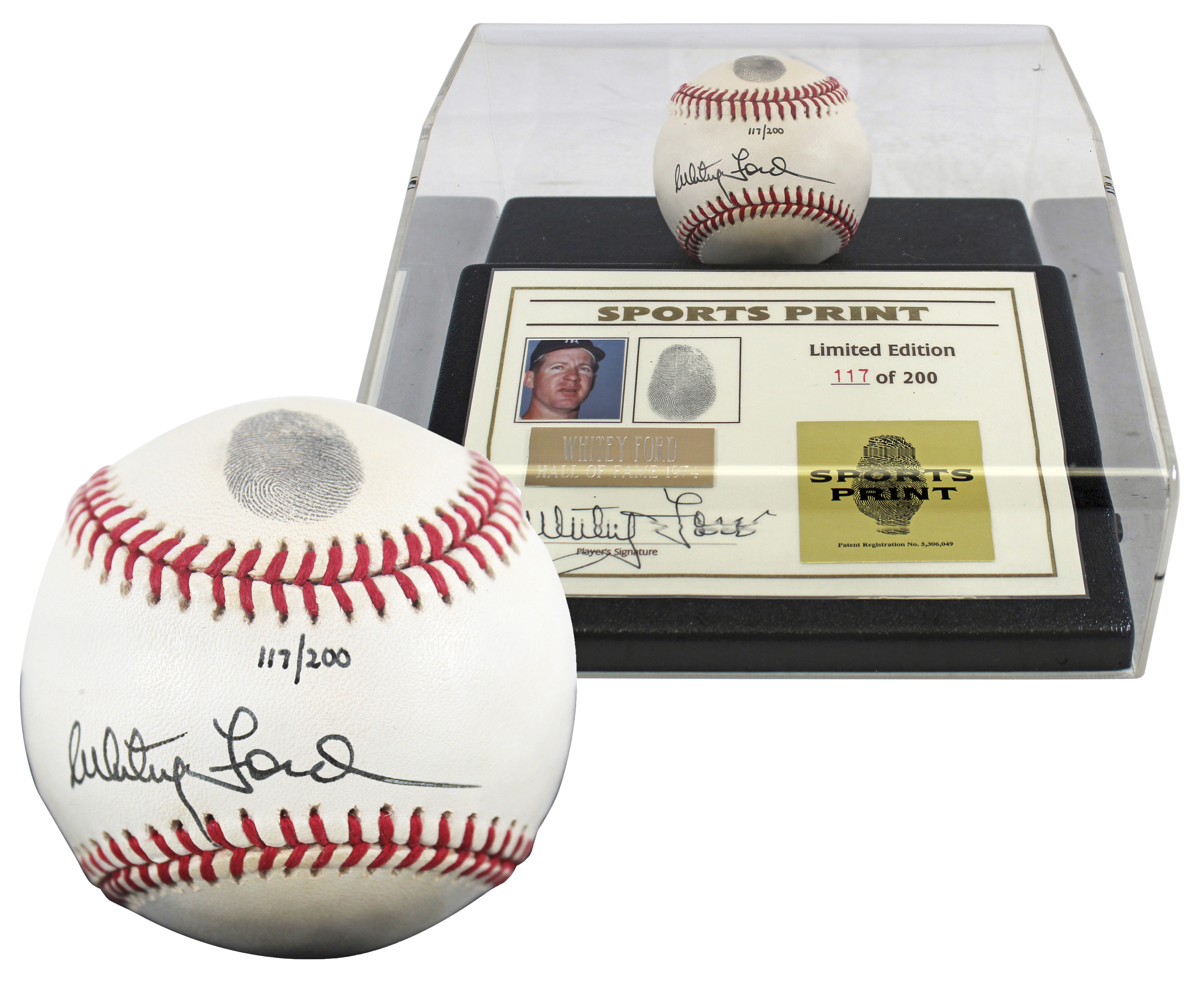 This Autographed Limited Edition Numbered To 200 w/ Display Case Thumbprint Oal Baseball has been Personally Signed by Whitey Ford of the New York Yankees. This item is 100% Authentic to include a Certificate of Authenticity (COA) / hologram by Beckett Authentication Services. We have multiples of this same item. While the photographs are representative of this item, the size, placement and strength of the signature may vary. Each item is hand signed, therefore, each autograph is unique. Each ball has a thumbprint of Whitey Ford , the photo in the case is also signed and has Whitey Ford signature, though the Beckett COA does not cover both signatures. These vintage balls all have some varying degrees of spotting and toning. We are not able to guarantee the coloring of the ball, and the number of the edition you may receive.