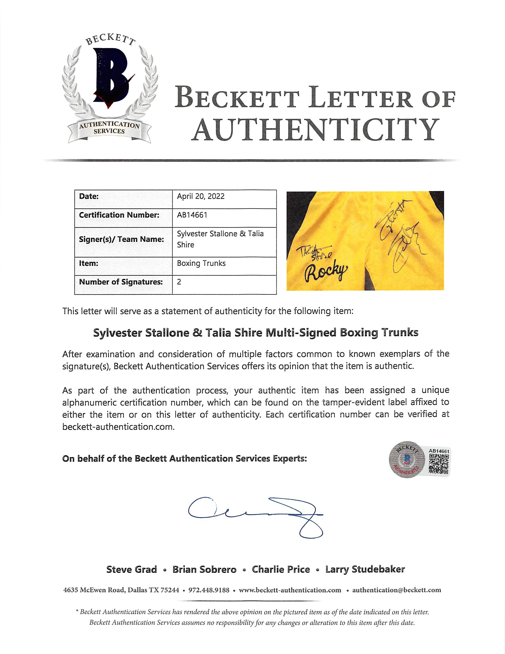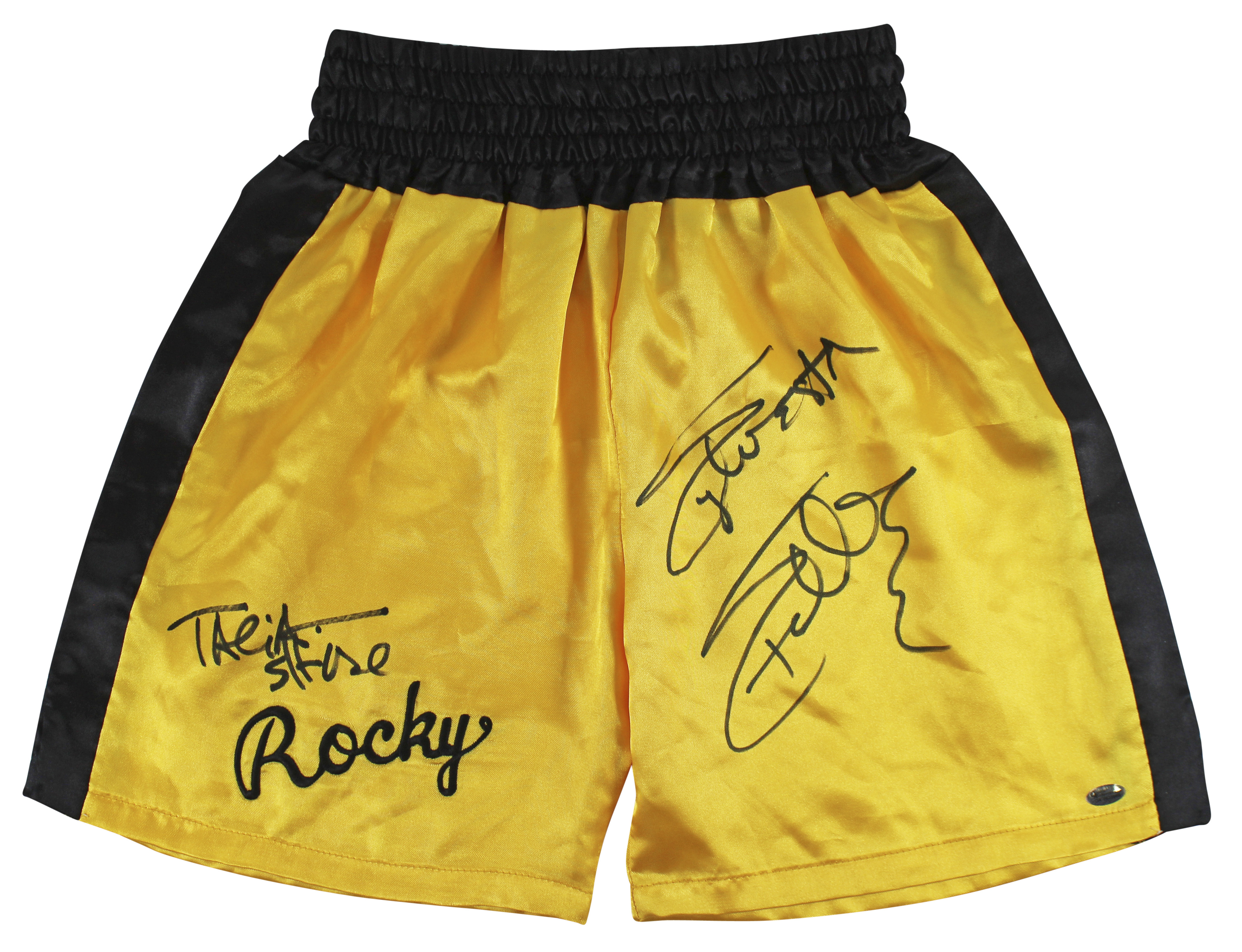 This Autographed Yellow Boxing Trunks has been Personally Signed by Sylvester Stallone & Talia Shire of Rocky. This item is 100% Authentic to include a Certificate of Authenticity (COA) / hologram by Beckett Authentication Services. The authenticity can be verified on Beckett Authentication Services website.