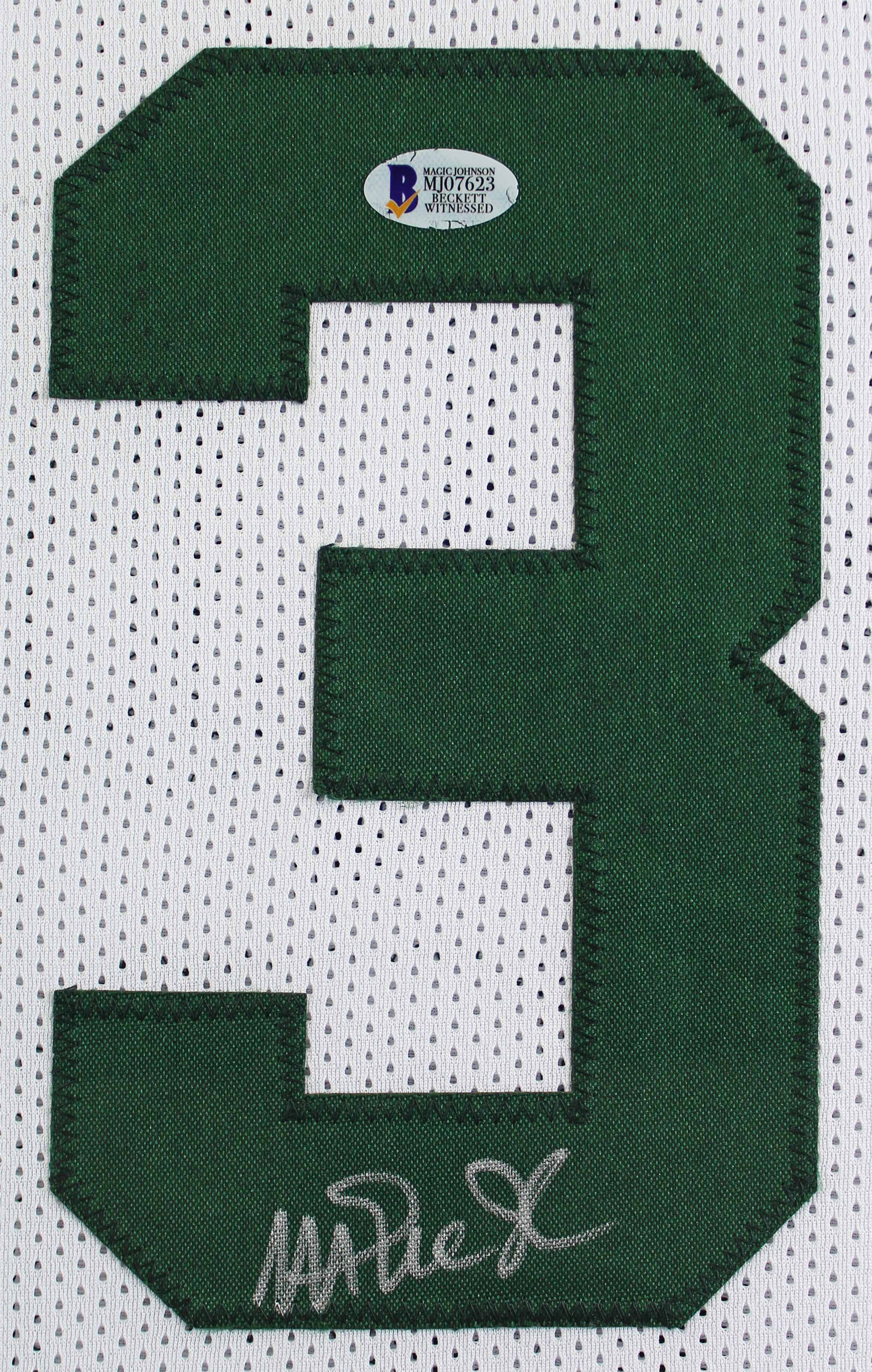 This Autographed White Pro Style Framed Jersey has been Personally Signed by Magic Johnson of the Michigan State Spartans. This item is 100% Authentic to include a hologram by Beckett Authentication Services. This item may come with the new Beckett Authentication hologram that has a scannable QR code rather than the traditional COA. If you would like to have a COA, you are welcome to reach out to Beckett for a printed certification once you receive your item. This is a BAS Witnessed Protection Program item which means a Beckett Authentication Service representative was present when this item was being signed. We conducted an autograph signing with Magic Johnson where multiples of the same item were signed. While the photographs are representative of this item, the size, placement and strength of the signature may vary. Each item is hand signed, therefore, each autograph is unique. This item can be verified through BAS Witnessed. This item has been professionally framed to overall dimensions of approximately 32 x 37 inches. This is a X-Large sized, non-branded, custom-stitched Framed Jersey.