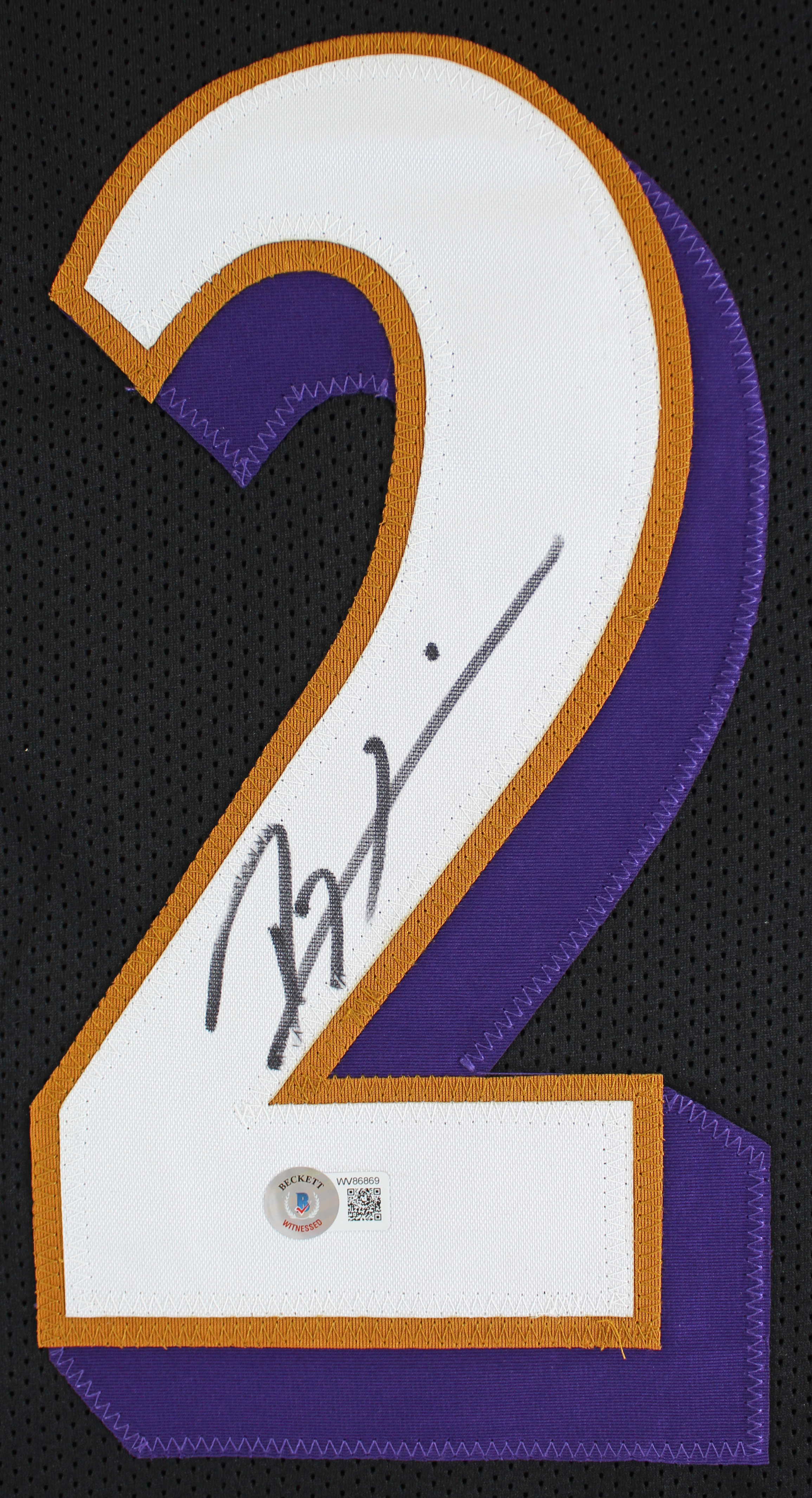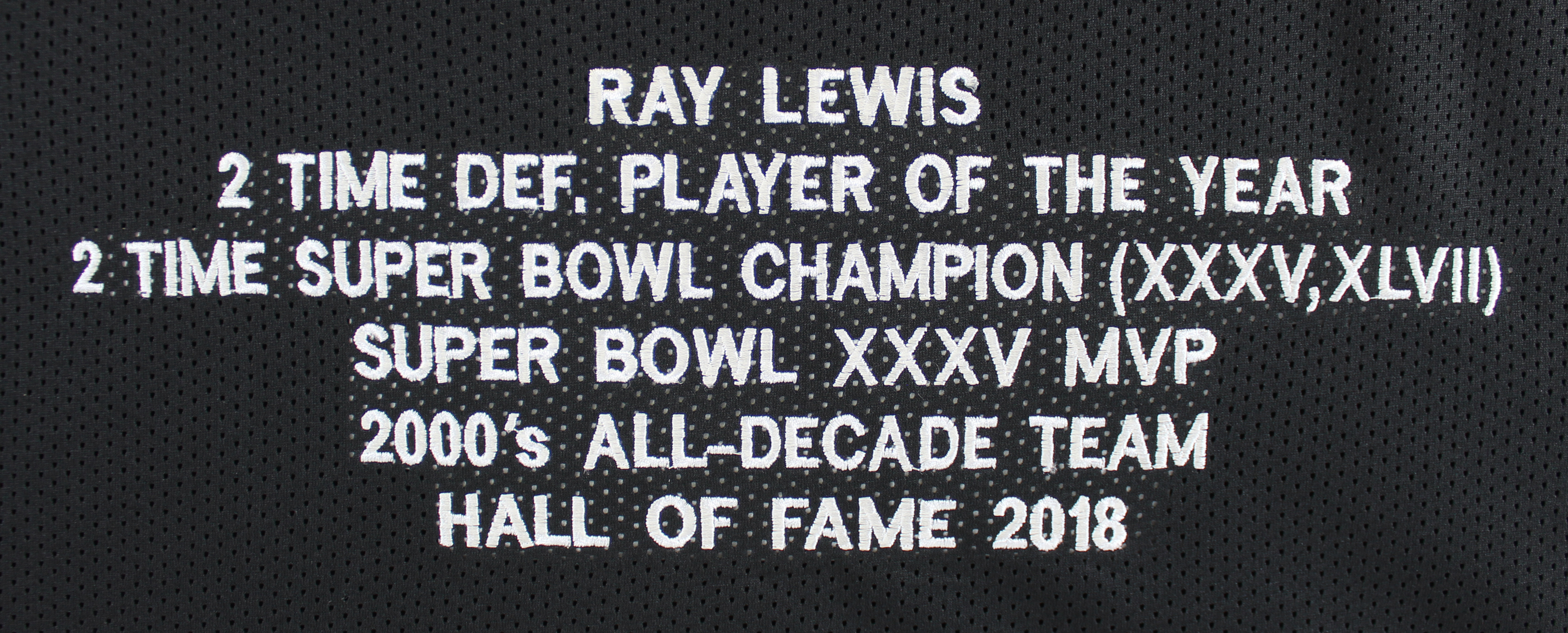 This Autographed Black Pro Style Embroidered Stat Jersey has been Personally Signed by Ray Lewis of the Baltimore Ravens. This item is 100% Authentic to include a hologram by Beckett Authentication Services. This item will come with the new Beckett Authentication hologram that has a scannable QR code rather than the traditional COA. If you would like to have a COA, you are welcome to reach out to Beckett for a printed certification once you receive your item. This is a BAS Witnessed Protection Program item which means a Beckett Authentication Service representative was present when this item was being signed. We conducted an autograph signing with Ray Lewis where multiples of the same item were signed. While the photographs are representative of this item, the size, placement and strength of the signature may vary. Each item is hand signed, therefore, each autograph is unique. This item can be verified through BAS Witnessed. This is a X-Large sized, non-branded, custom-stitched Jersey.