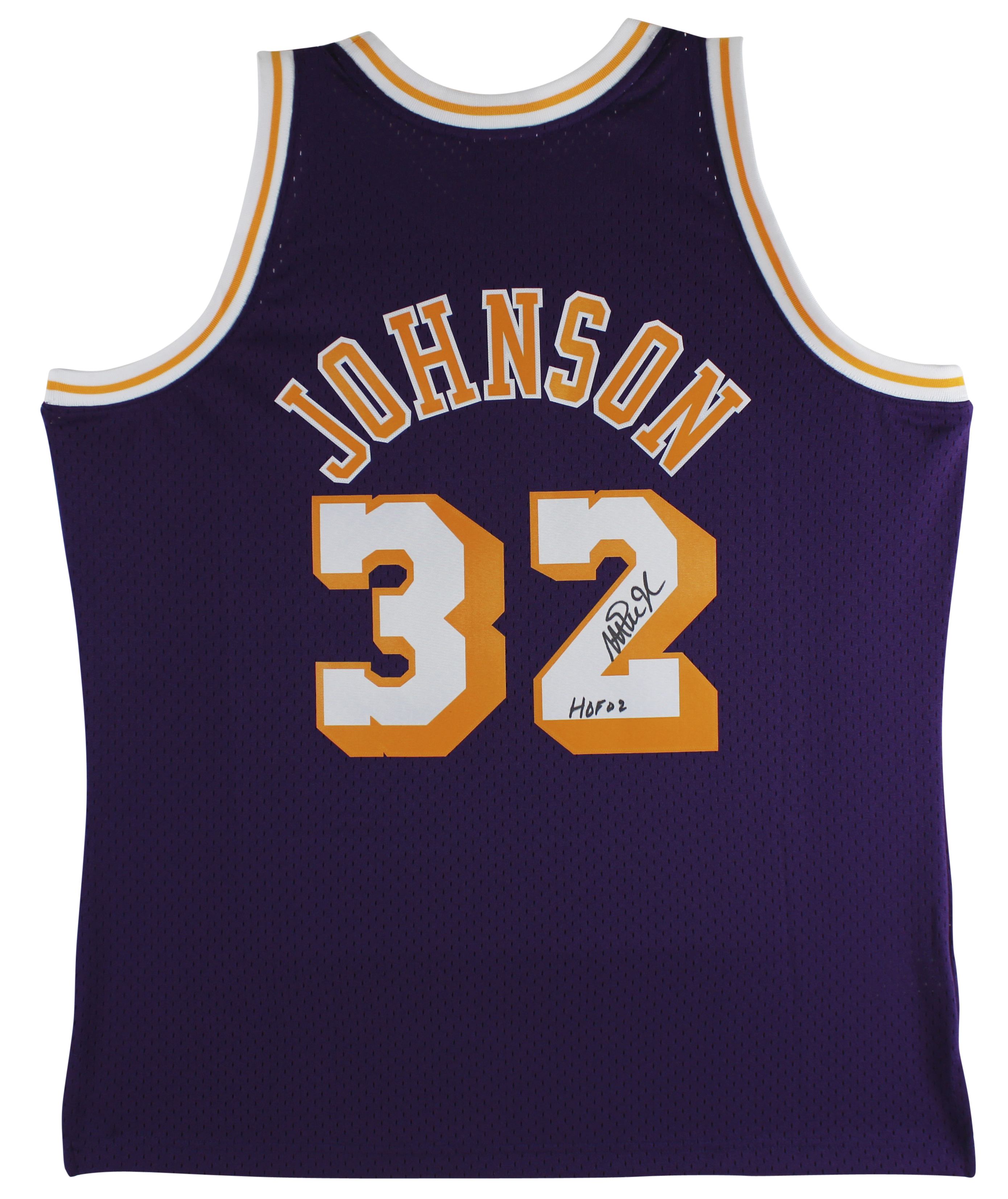 This Autographed Yellow Mitchell & Ness Hardwood Classics Swingman Jersey with the inscription of "HOF 02" has been Personally Signed by Magic Johnson of the Los Angeles Lakers. This item is 100% Authentic to include a hologram by Beckett Authentication Services. This item will come with the new Beckett Authentication hologram that has a scannable QR code rather than the traditional COA. If you would like to have a COA, you are welcome to reach out to Beckett for a printed certification once you receive your item. This is a BAS Witnessed Protection Program item which means a Beckett Authentication Service representative was present when this item was being signed. We conducted an autograph signing with Magic Johnson where multiples of the same item were signed. While the photographs are representative of this item, the size, placement and strength of the signature may vary. Each item is hand signed, therefore, each autograph is unique. This item can be verified through BAS Witnessed. This is a X-Large sized, non-branded, custom-stitched Jersey.