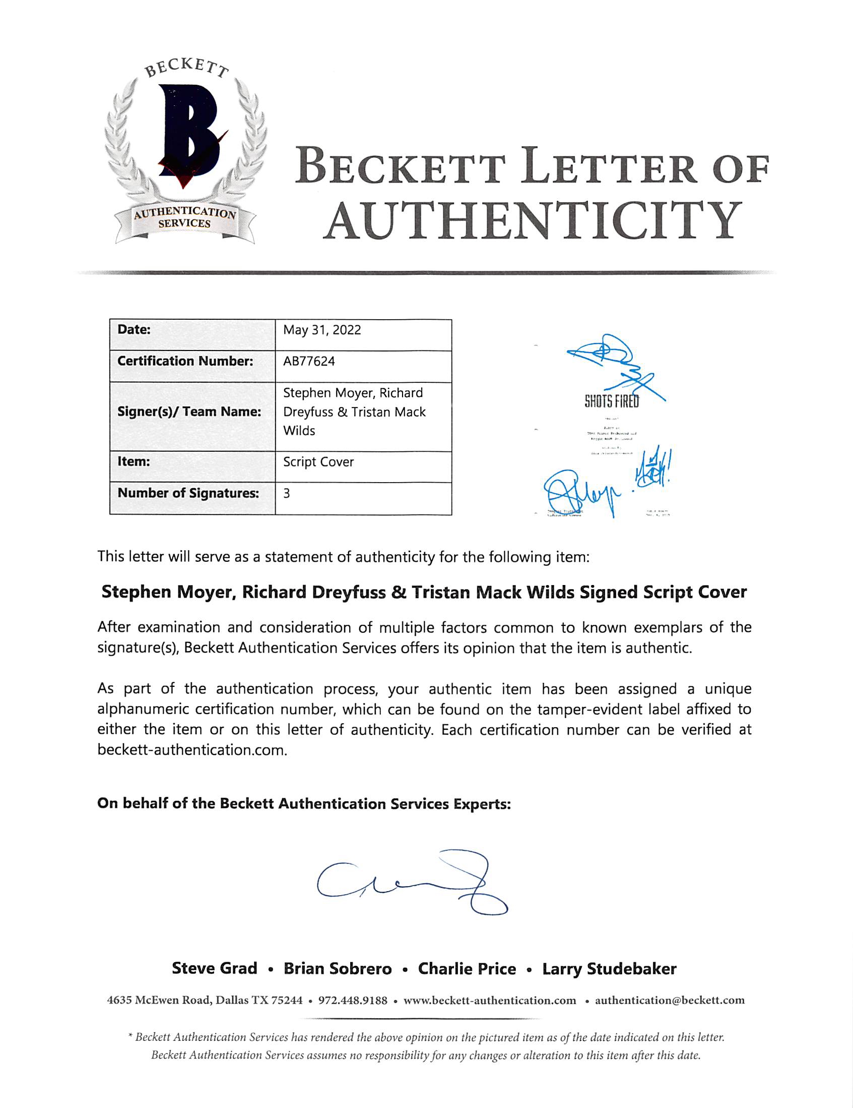 This Autographed Shots Fired 8.5x11 Script Cover has been Personally Signed by Stephen Moyer, Richard Dreyfuss & Tristan Mack Wilds of Shots Fired. This item is 100% Authentic to include a Certificate of Authenticity (COA) / hologram by Beckett Authentication Services. The authenticity can be verified on Beckett Authentication Services website.