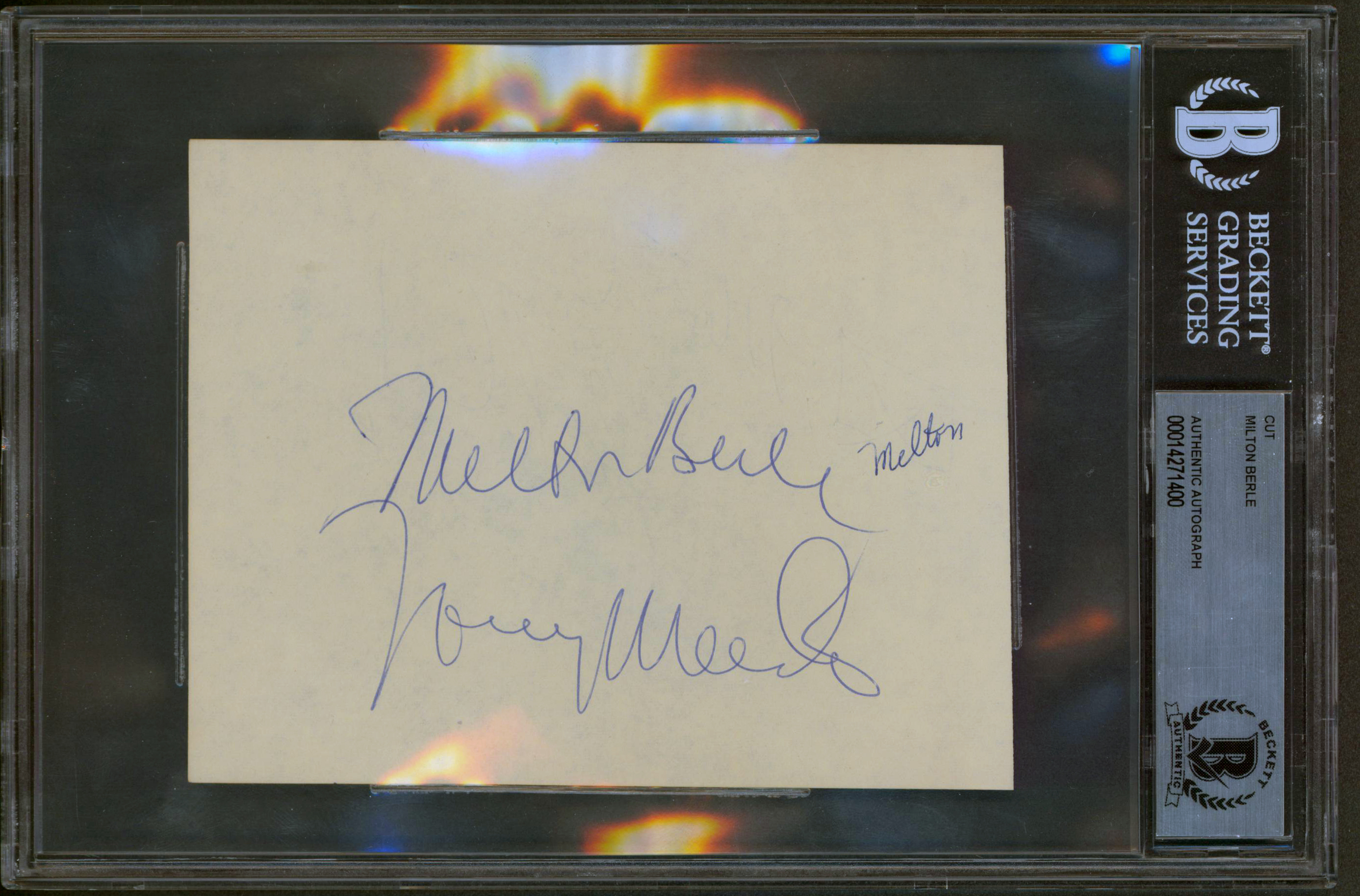This Autographed 4.5 x 5.5 Cut Signature has been Personally Signed by Milton Berle of The Milton Berle Show. This item is 100% Authentic, it comes slabbed and authenticated by Beckett Authentication Services. The authenticity can be verified on Beckett Authentication Services website.