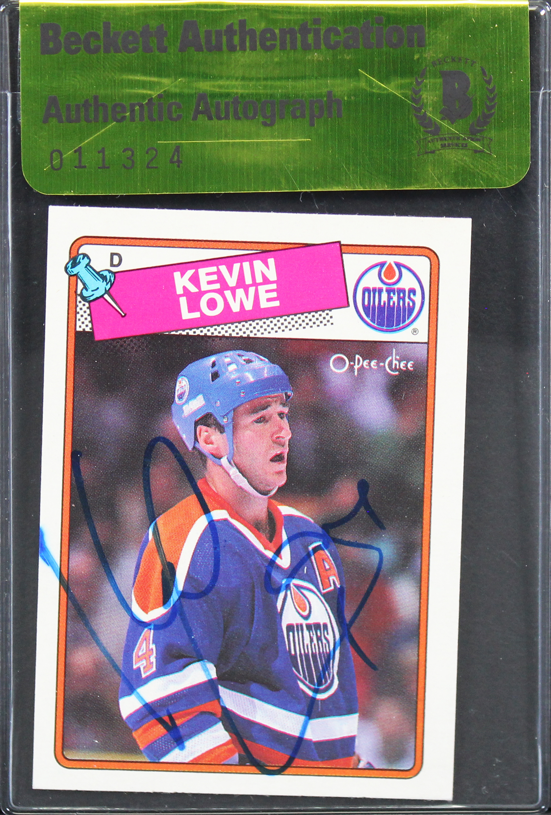 This Autographed 1988 O-PEE-CHEE #229 Card has been Personally Signed by Kevin Lowe of the Edmonton Oilers. This item is 100% Authentic, it has been review by Beckett Authentication Services. It comes in a sealed card saver, with a tamper proof sticker denoting the authenticity review by Beckett. The authenticity is not searchable in the Beckett Database.