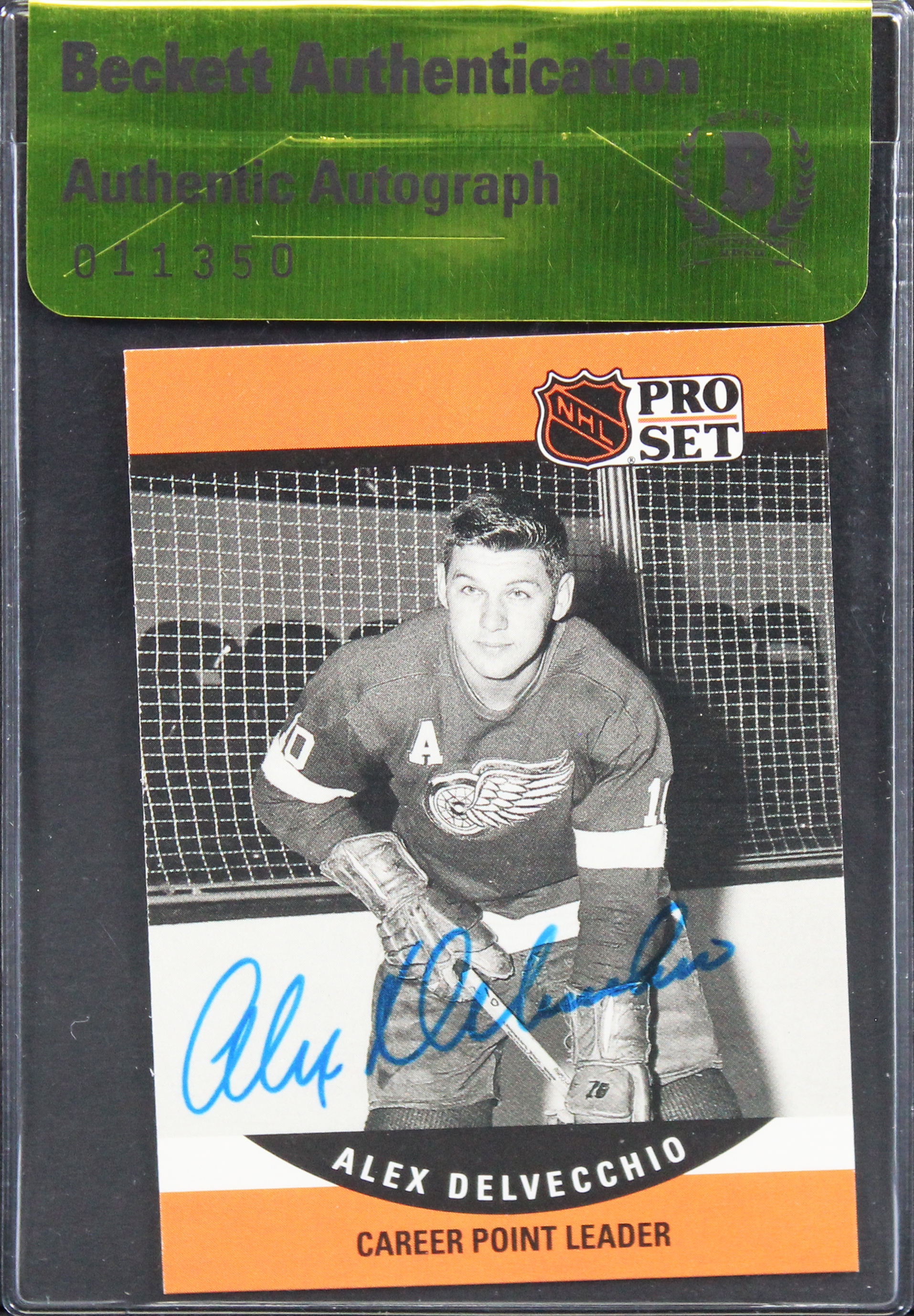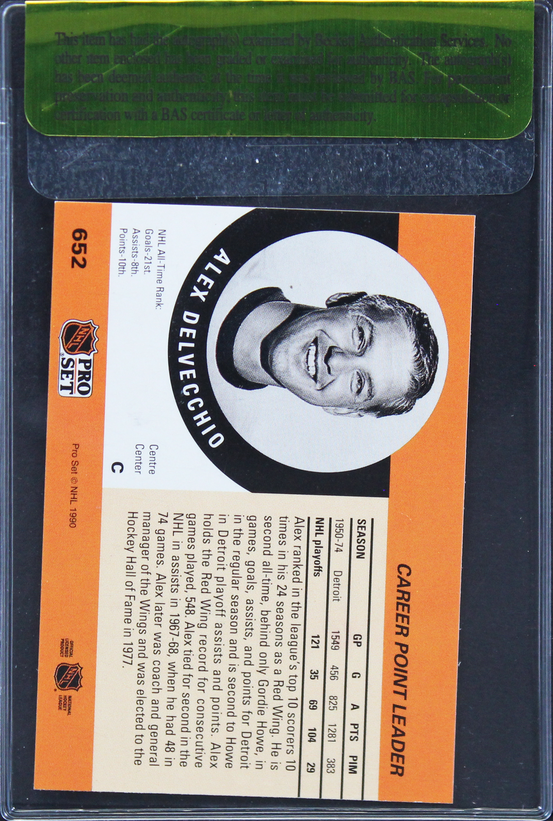 This Autographed 1990 NHL Pro Set #652 Card has been Personally Signed by Alex Delvecchio of the Detroit Red Wings. This item is 100% Authentic, it has been review by Beckett Authentication Services. It comes in a sealed card saver, with a tamper proof sticker denoting the authenticity review by Beckett. The authenticity is not searchable in the Beckett Database.