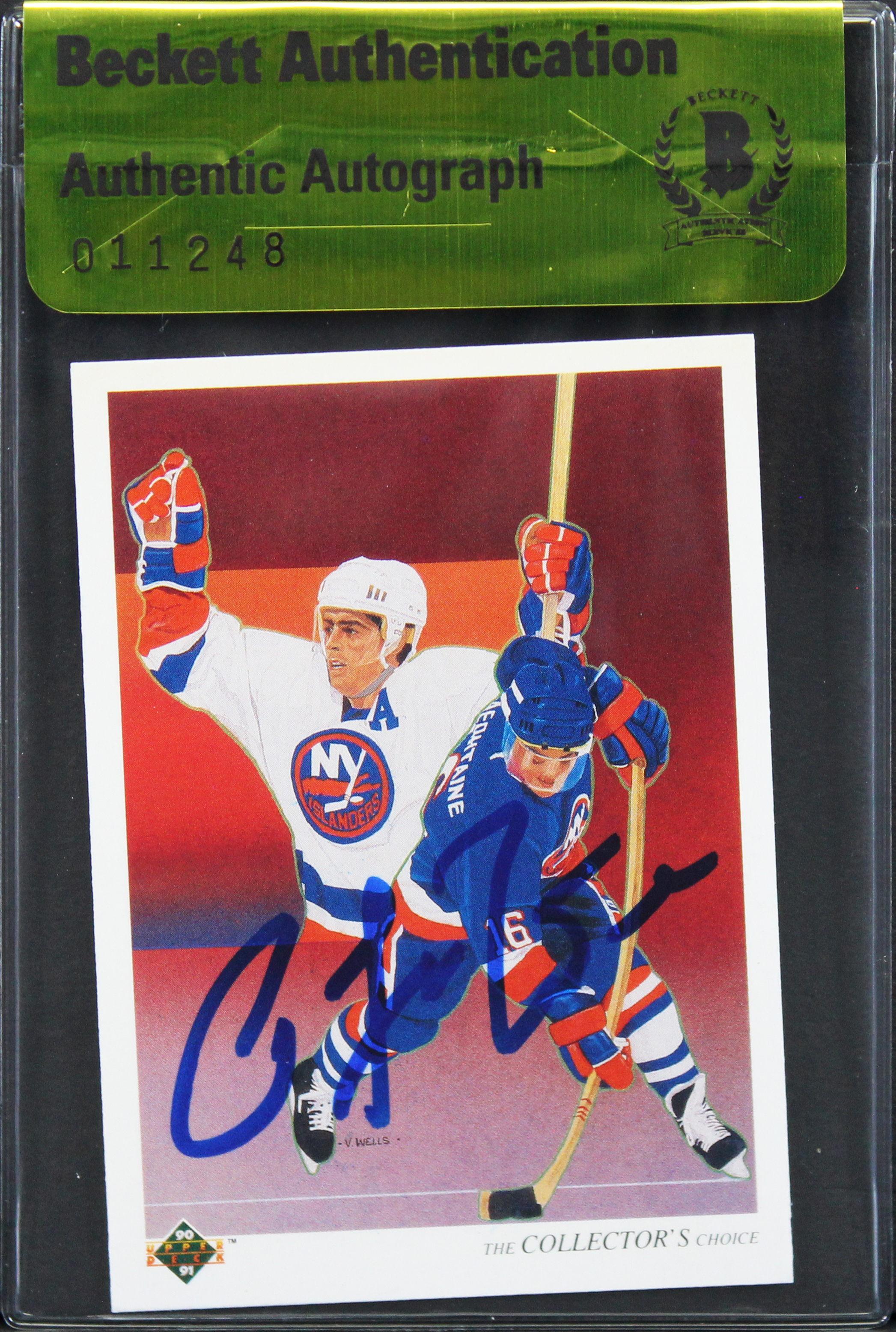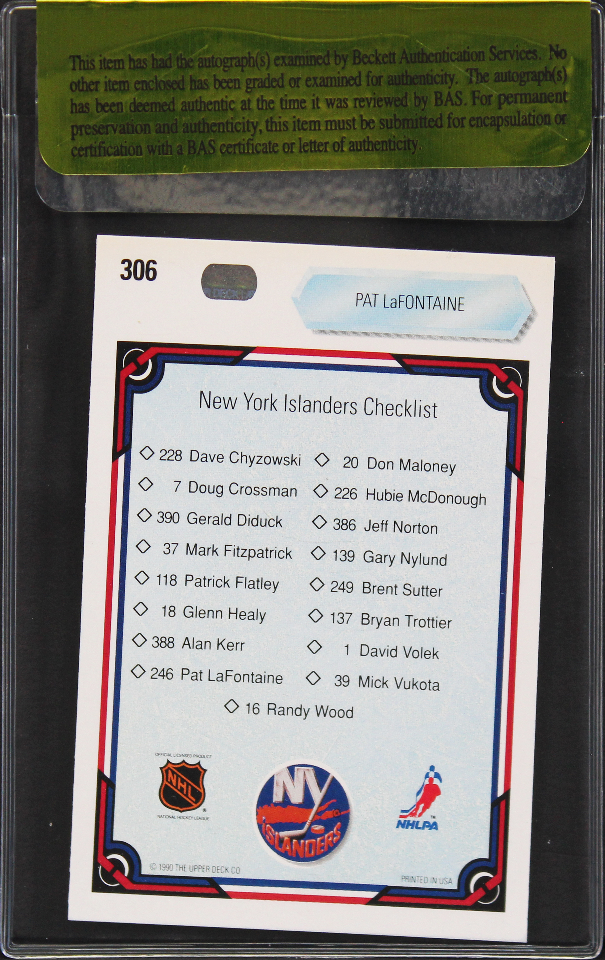This Autographed 1990 Upper Deck #306 Card has been Personally Signed by Pat LaFontaine of the New York Islanders. This item is 100% Authentic, it has been review by Beckett Authentication Services. It comes in a sealed card saver, with a tamper proof sticker denoting the authenticity review by Beckett. The authenticity is not searchable in the Beckett Database.