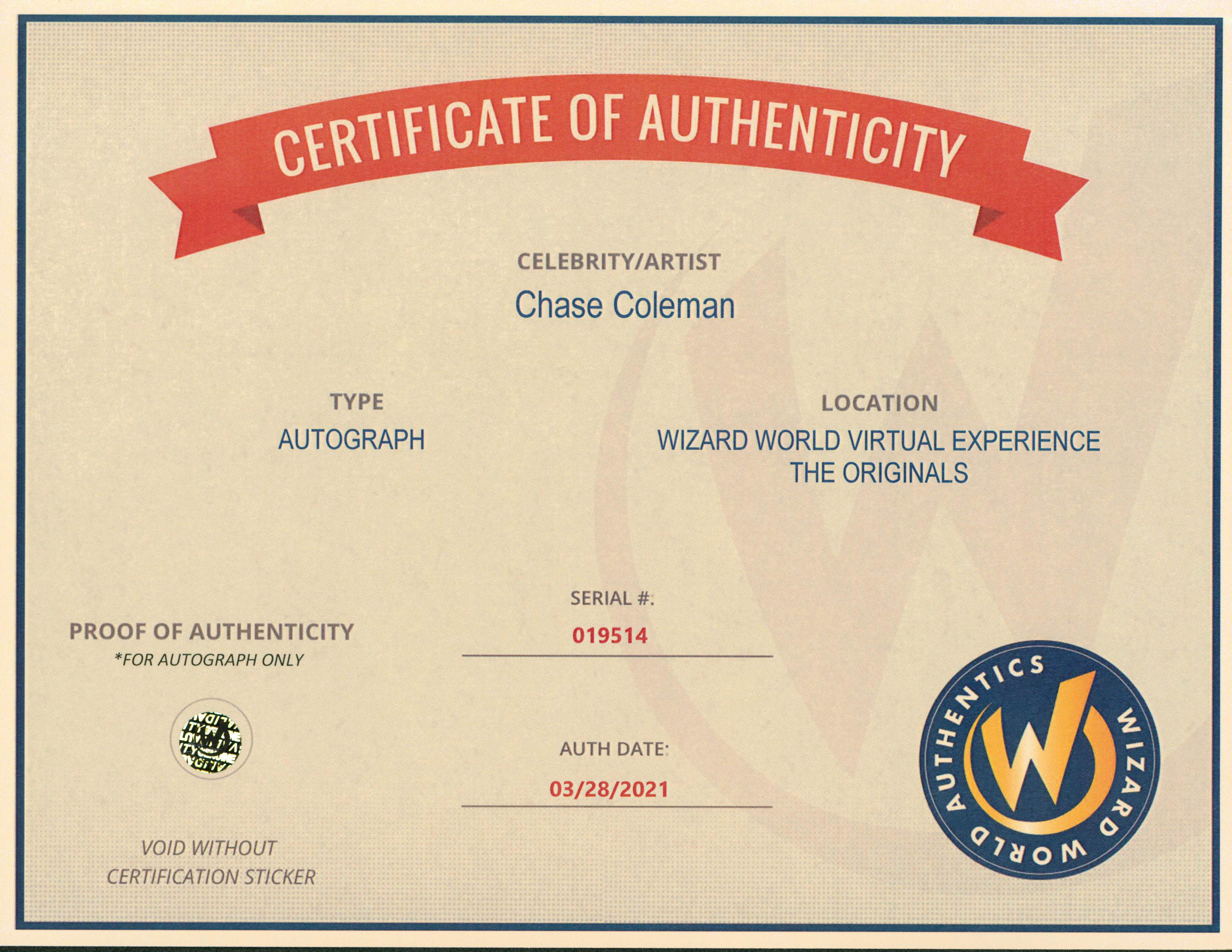 This Autographed 8x10 Photo has been Personally Signed by Chase Coleman of The Originals. This item is 100% Authentic to include a Certificate of Authenticity (COA) / hologram by Wizard World Authentics. A Wizard World Authentics representative was present when this item was being signed, the date of the signing is notated on the COA. We have multiples of this same item. While the photographs are representative of this item, the size, placement and strength of the signature may vary. Each item is hand signed, therefore, each autograph is unique.