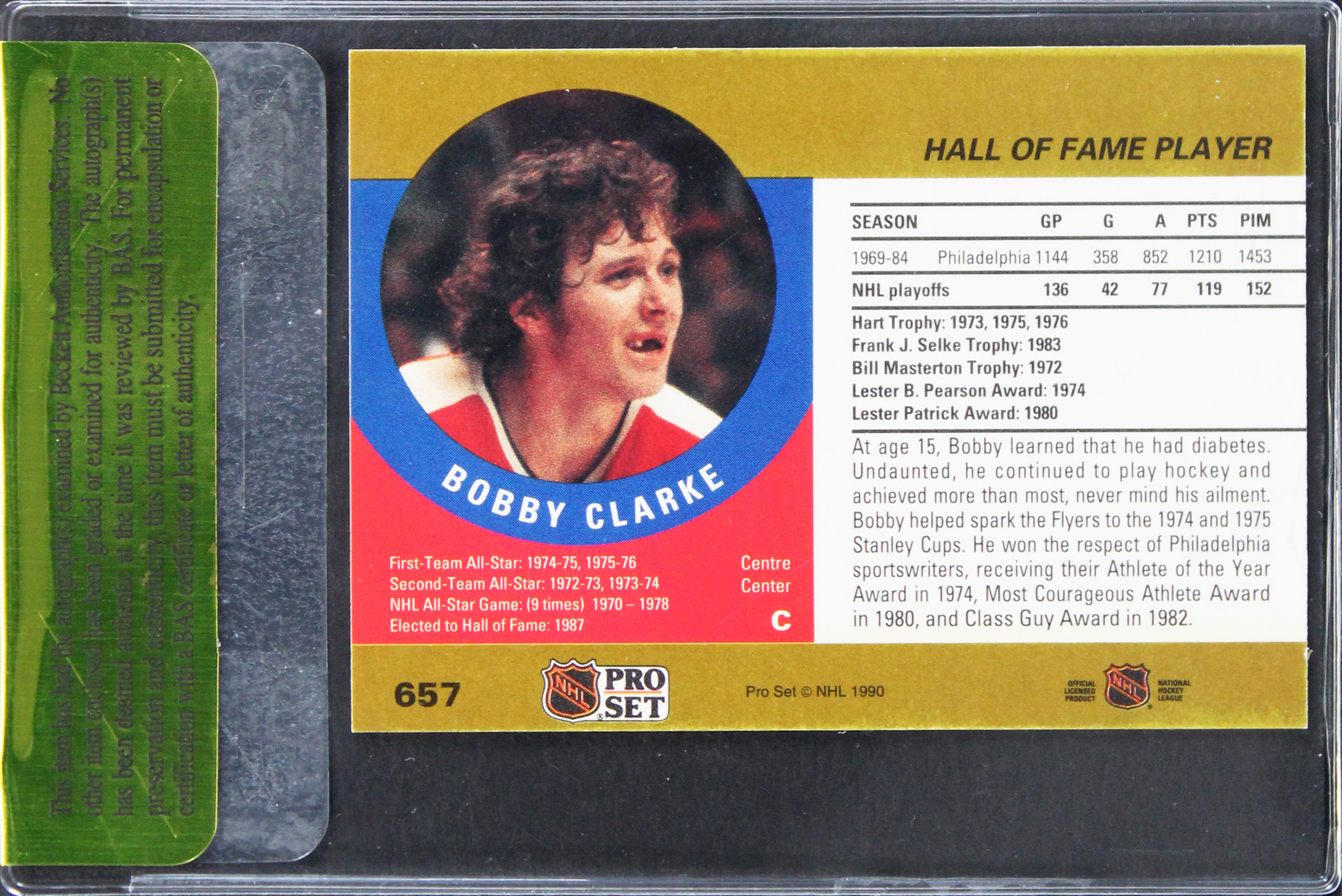 This Autographed 1990 NHL Pro Set #657 Card has been Personally Signed by Bobby Clarke of the Philadelphia Flyers. This item is 100% Authentic, it has been review by Beckett Authentication Services. It comes in a sealed card saver, with a tamper proof sticker denoting the authenticity review by Beckett. The authenticity is not searchable in the Beckett Database.