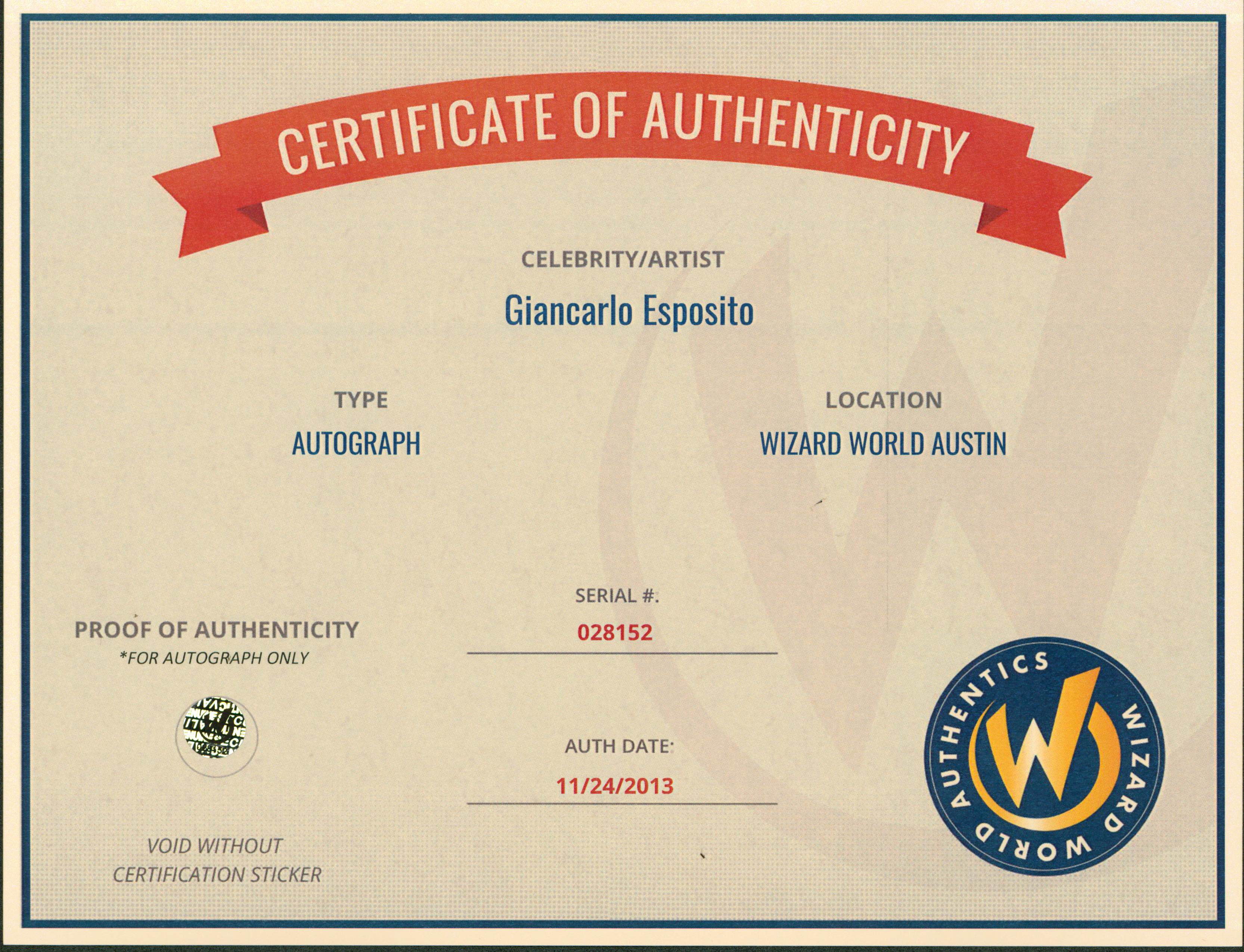 This Autographed 8x10 Photo has been Personally Signed by Giancarlo Esposito of Revolution. This item is 100% Authentic to include a Certificate of Authenticity (COA) / hologram by Wizard World Authentics. A Wizard World Authentics representative was present when this item was being signed, the date of the signing is notated on the COA. We have multiples of this same item. While the photographs are representative of this item, the size, placement and strength of the signature may vary. Each item is hand signed, therefore, each autograph is unique.