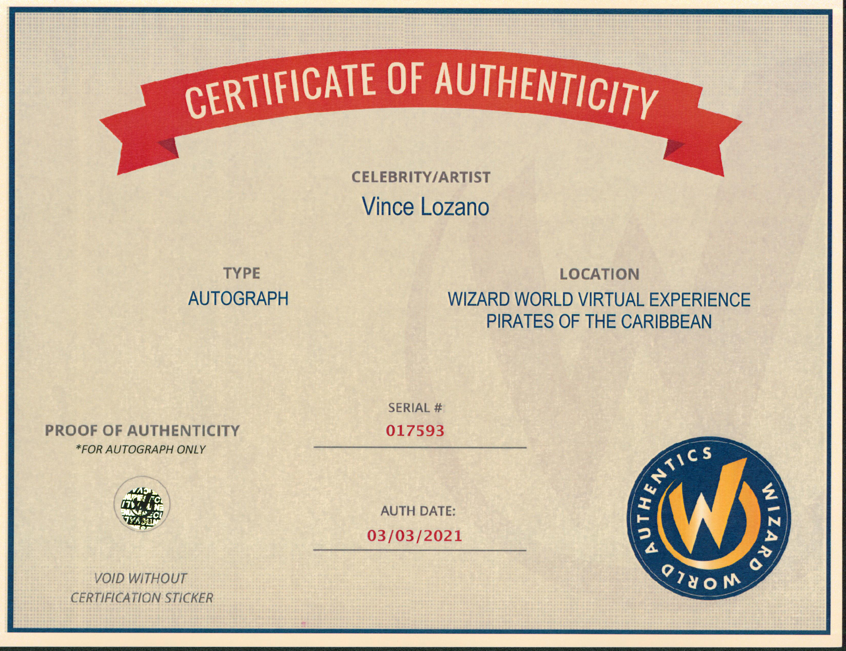 This Autographed 8x10 Photo with the inscription of "No Fair! Jacoby" has been Personally Signed by Vince Lozano of Pirates Of The Caribbean. This item is 100% Authentic to include a Certificate of Authenticity (COA) / hologram by Wizard World Authentics. A Wizard World Authentics representative was present when this item was being signed, the date of the signing is notated on the COA. We have multiples of this same item. While the photographs are representative of this item, the size, placement and strength of the signature may vary. Each item is hand signed, therefore, each autograph is unique.