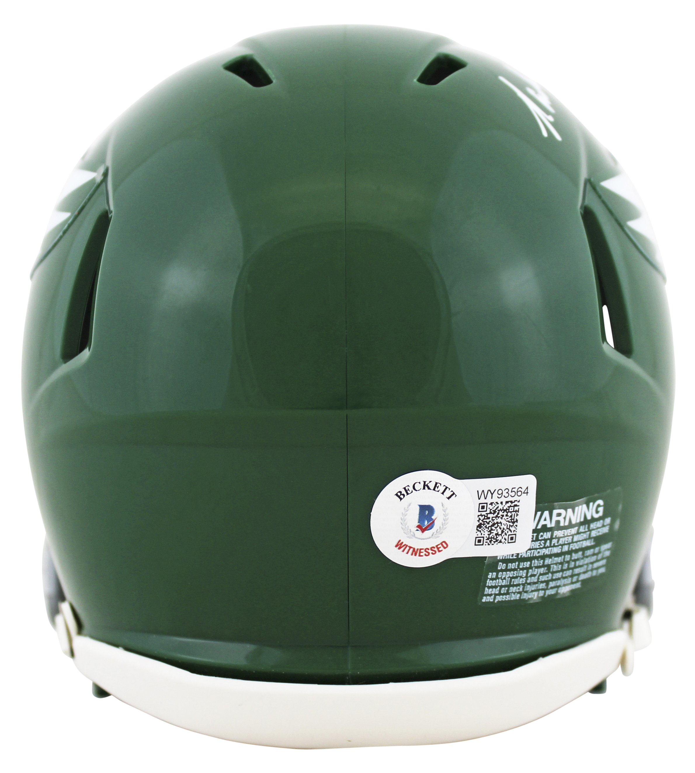 This Autographed 1974-95 Throwback Speed Mini Helmet has been Personally Signed by Randall Cunningham of the Philadelphia Eagles. This item is 100% Authentic to include a Certificate of Authenticity (COA) / hologram by Beckett Authentication Services. This is a BAS Witnessed Protection Program item which means a Beckett Authentication Service representative was present when this item was being signed. We conducted an autograph signing with Randall Cunningham where multiples of the same item were signed. While the photographs are representative of this item, the size, placement and strength of the signature may vary. Each item is hand signed, therefore, each autograph is unique. This item can be verified through BAS Witnessed.