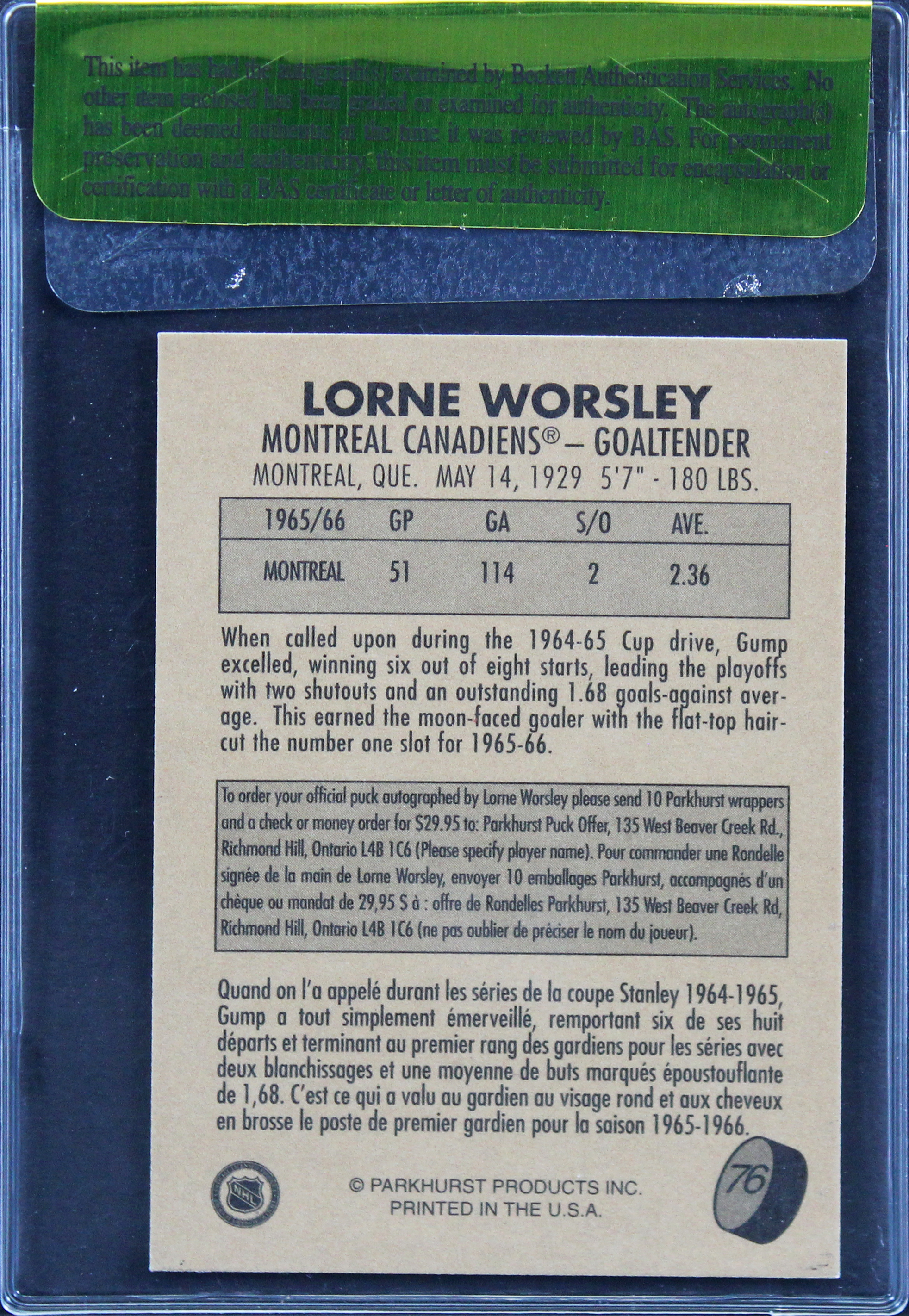 This Autographed 1995 Parkhurst #76 Card has been Personally Signed by Lorne Worsley of the Montreal Canadiens. This item is 100% Authentic, it has been review by Beckett Authentication Services. It comes in a sealed card saver, with a tamper proof sticker denoting the authenticity review by Beckett. The authenticity is not searchable in the Beckett Database.