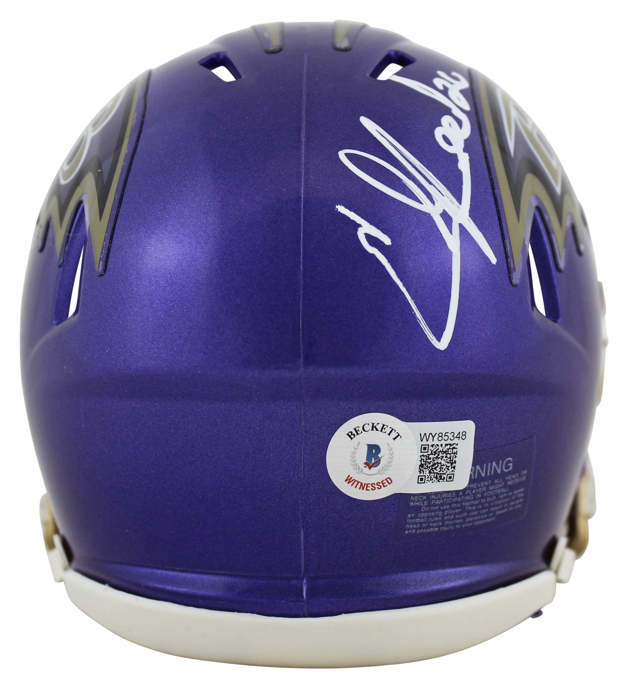 This Autographed Alternate Flash Speed Mini Helmet has been Personally Signed by Ed Reed of the Baltimore Ravens. This item is 100% Authentic to include a hologram by Beckett Authentication Services. This item may come with the new Beckett Authentication hologram that has a scannable QR code rather than the traditional COA. If you would like to have a COA, you are welcome to reach out to Beckett for a printed certification once you receive your item. This is a BAS Witnessed Protection Program item which means a Beckett Authentication Service representative was present when this item was being signed. We conducted an autograph signing with Ed Reed where multiples of the same item were signed. While the photographs are representative of this item, the size, placement and strength of the signature may vary. Each item is hand signed, therefore, each autograph is unique. This item can be verified through BAS Witnessed.