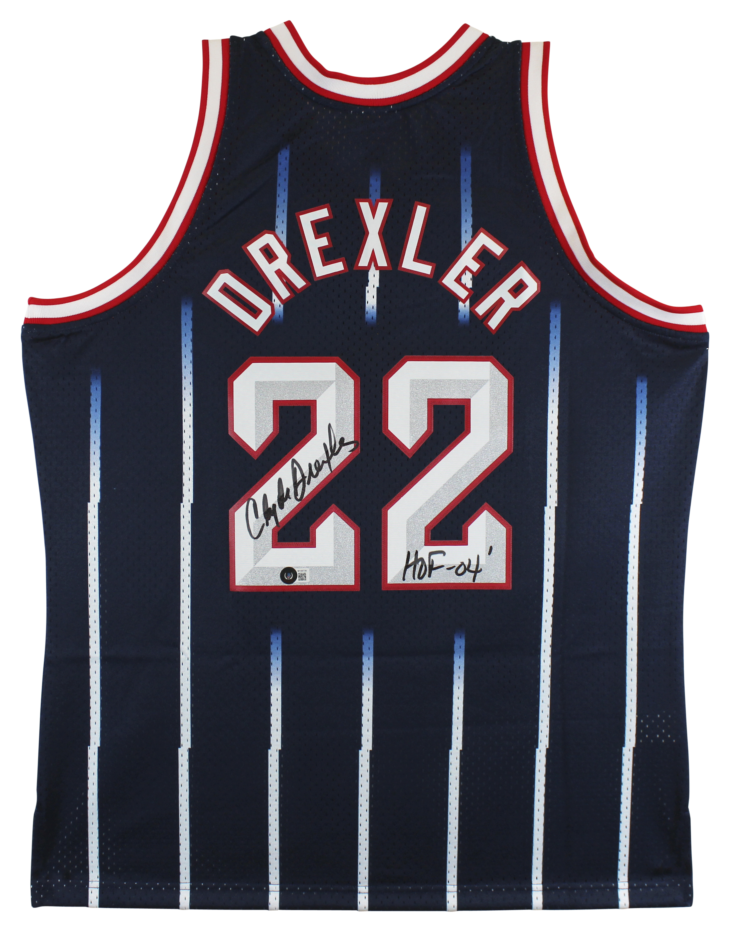 This Autographed Navy Blue Mitchell & Ness Jersey with the inscription of "HOF 04" has been Personally Signed by Clyde Drexler of the Houston Rockets. This item is 100% Authentic to include a hologram by Beckett Authentication Services. This item may come with the new Beckett Authentication hologram that has a scannable QR code rather than the traditional COA. If you would like to have a COA, you are welcome to reach out to Beckett for a printed certification once you receive your item. This is a BAS Witnessed Protection Program item which means a Beckett Authentication Service representative was present when this item was being signed. We conducted an autograph signing with Clyde Drexler where multiples of the same item were signed. While the photographs are representative of this item, the size, placement and strength of the signature may vary. Each item is hand signed, therefore, each autograph is unique. This item can be verified through BAS Witnessed. This is a X-Large sized, non-branded, custom-stitched Jersey.