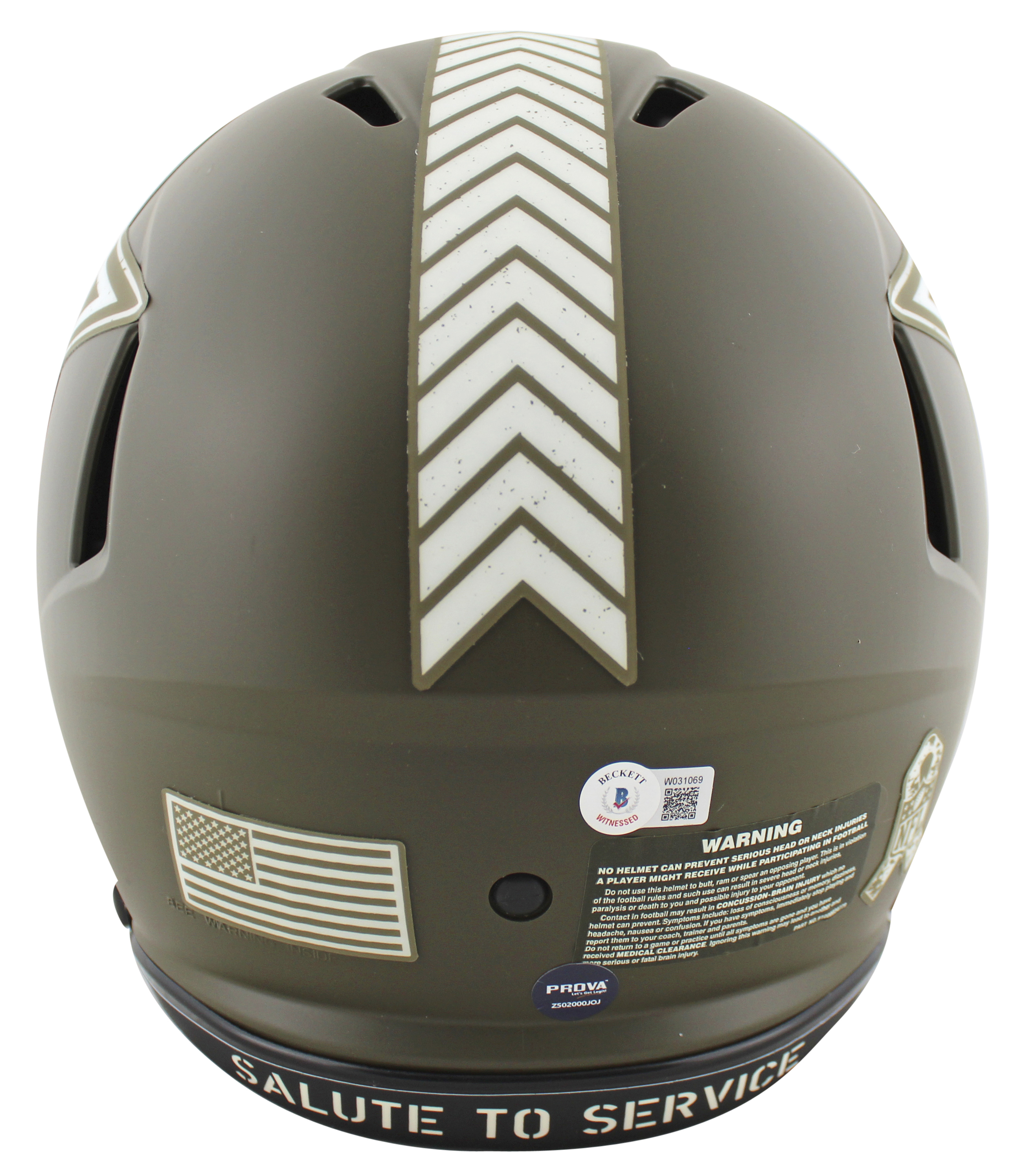 This Autographed Alternate Salute To Service Riddell Authentic Full Size Speed Proline Helmet has been Personally Signed by Emmitt Smith of the Dallas Cowboys. This item is 100% Authentic to include a hologram by Beckett Authentication Services. This item may come with the new Beckett Authentication hologram that has a scannable QR code rather than the traditional COA. If you would like to have a COA, you are welcome to reach out to Beckett for a printed certification once you receive your item. This is a BAS Witnessed Protection Program item which means a Beckett Authentication Service representative was present when this item was being signed. We conducted an autograph signing with Emmitt Smith where multiples of the same item were signed. While the photographs are representative of this item, the size, placement and strength of the signature may vary. Each item is hand signed, therefore, each autograph is unique. This item can be verified through BAS Witnessed.
