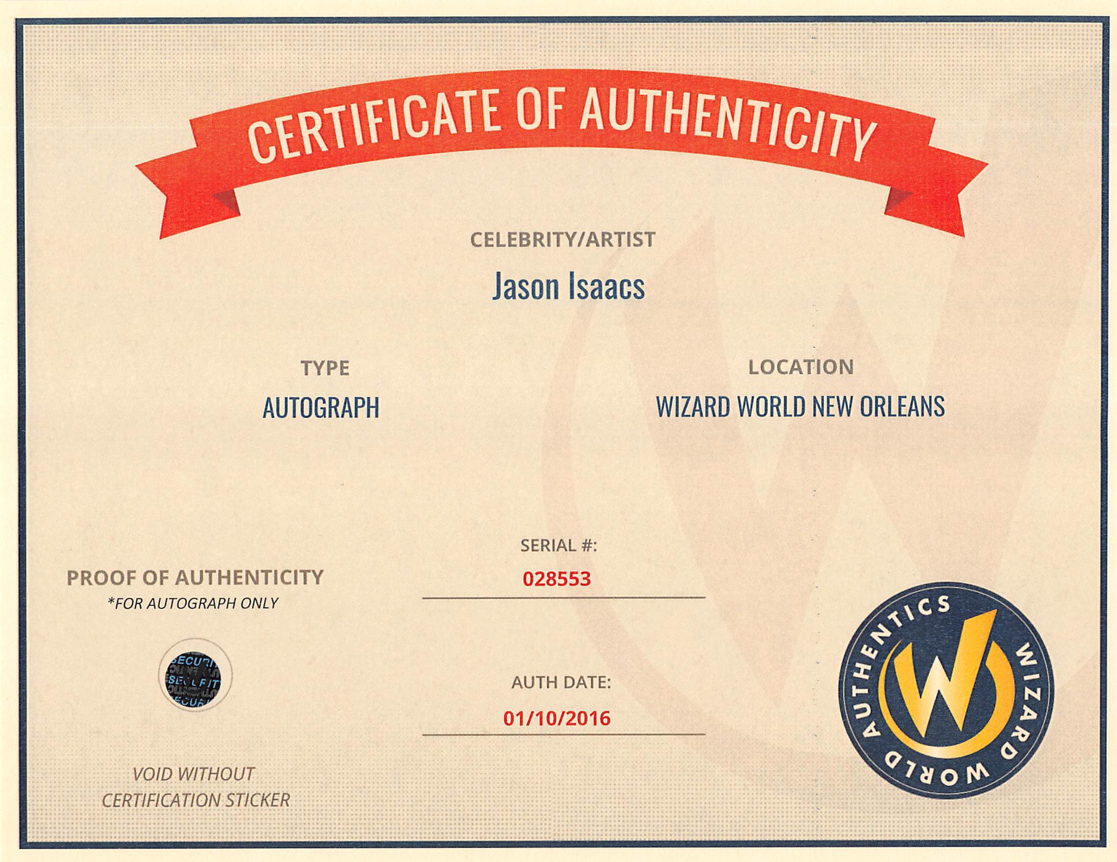 This Autographed 8x10 Photo has been Personally Signed by Jason Isaacs of Event Horizon. This item is 100% Authentic to include a Certificate of Authenticity (COA) / hologram by Wizard World Authentics. A Wizard World Authentics representative was present when this item was being signed, the date of the signing is notated on the COA. We have multiples of this same item. While the photographs are representative of this item, the size, placement and strength of the signature may vary. Each item is hand signed, therefore, each autograph is unique.