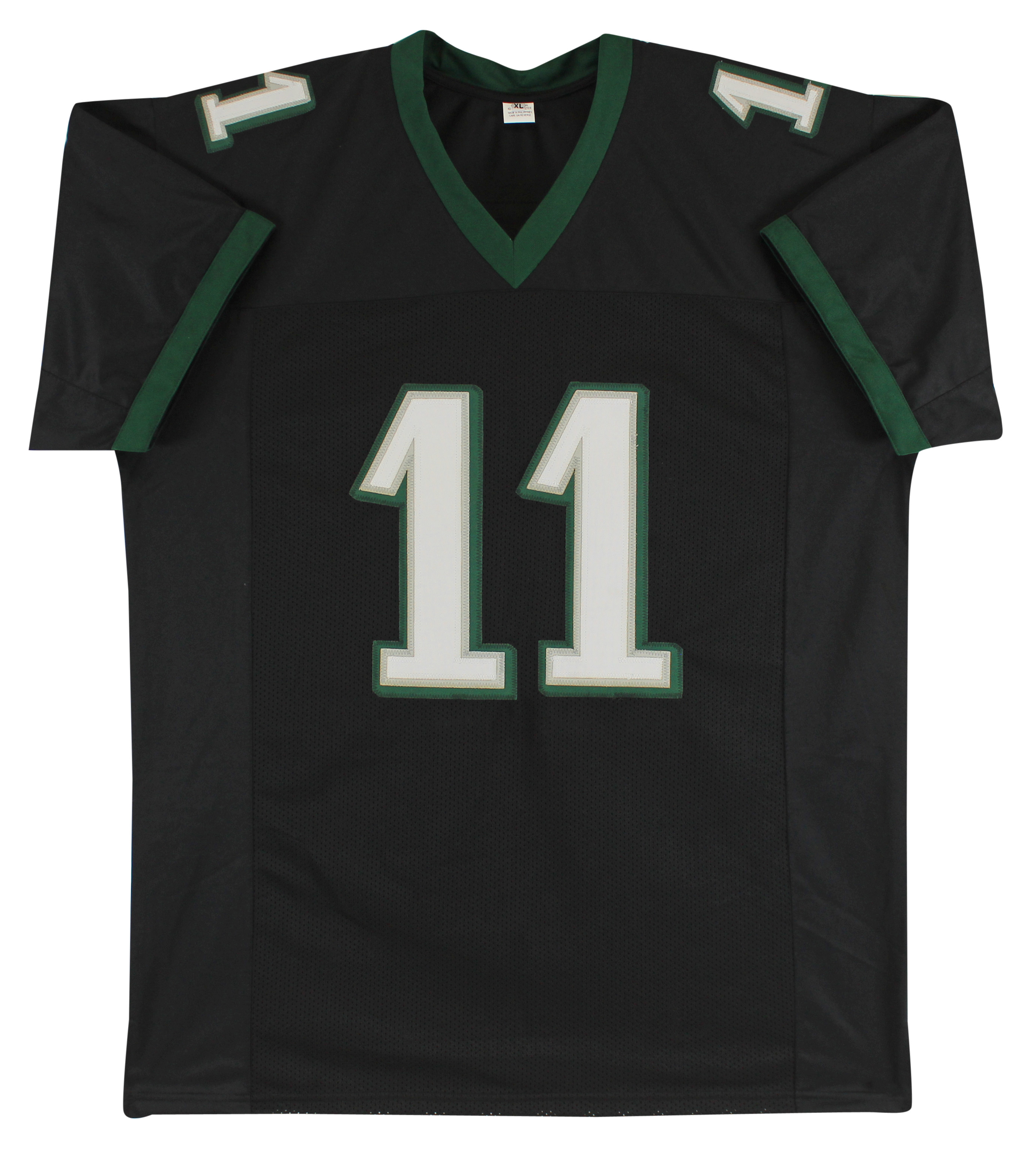 This Autographed Black Pro Style Jersey has been Personally Signed by A.J. Brown of the Philadelphia Eagles. This item is 100% Authentic to include a hologram by Beckett Authentication Services. This item may come with the new Beckett Authentication hologram that has a scannable QR code rather than the traditional COA. If you would like to have a COA, you are welcome to reach out to Beckett for a printed certification once you receive your item. This is a BAS Witnessed Protection Program item which means a Beckett Authentication Service representative was present when this item was being signed. We conducted an autograph signing with A.J. Brown where multiples of the same item were signed. While the photographs are representative of this item, the size, placement and strength of the signature may vary. Each item is hand signed, therefore, each autograph is unique. This item can be verified through BAS Witnessed. This is a X-Large sized, non-branded, custom-stitched Jersey.