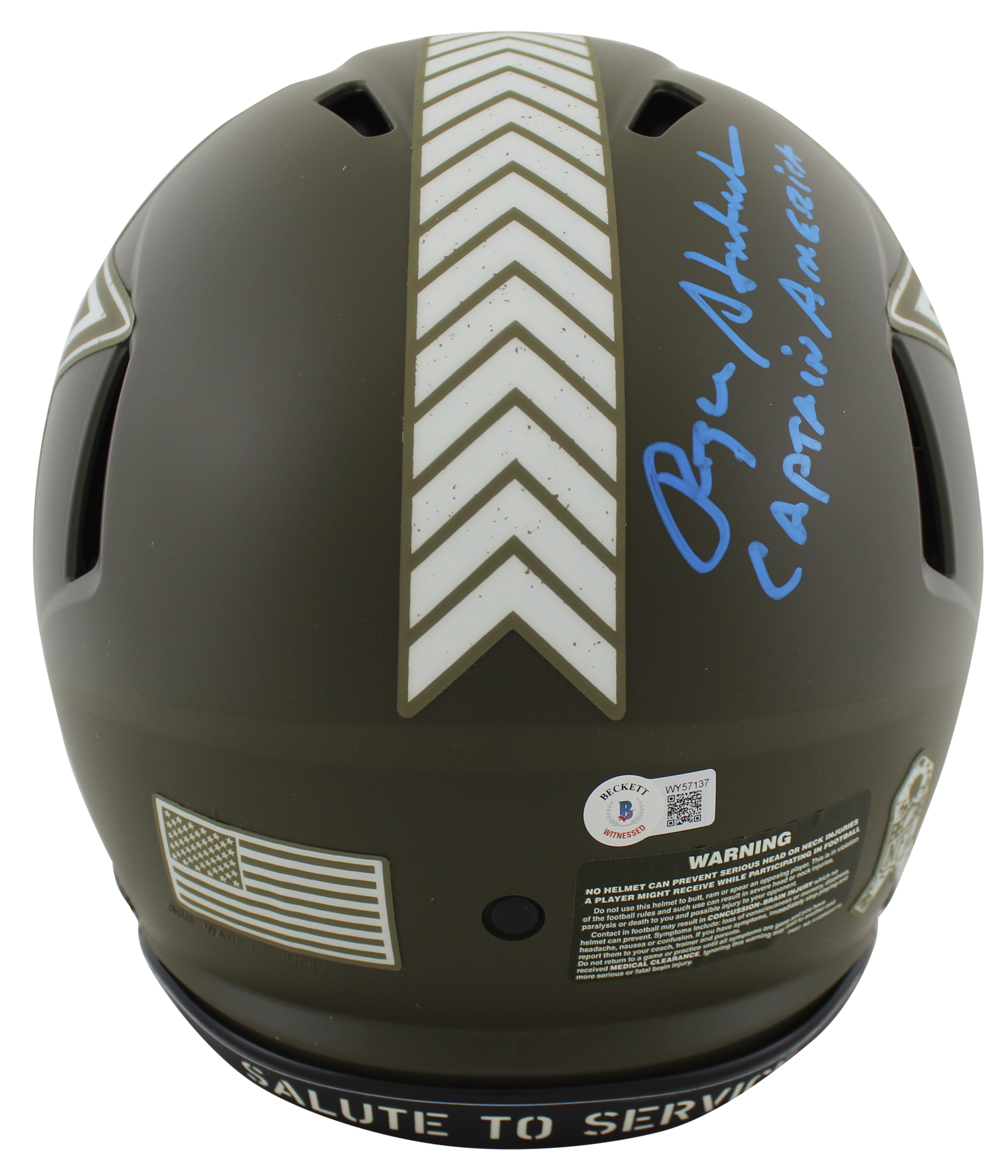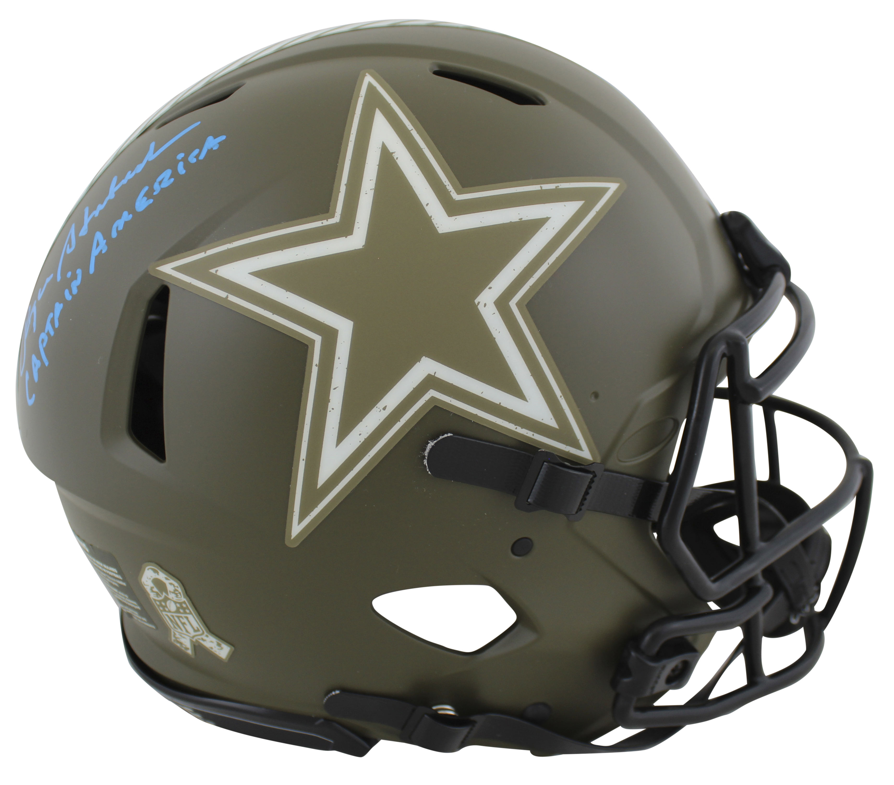 This Autographed Alternate Salute To Service Riddell Authentic Full Size Speed Proline Helmet with the inscription of "Captain America" has been Personally Signed by Roger Staubach of the Dallas Cowboys. This item is 100% Authentic to include a hologram by Beckett Authentication Services. This item may come with the new Beckett Authentication hologram that has a scannable QR code rather than the traditional COA. If you would like to have a COA, you are welcome to reach out to Beckett for a printed certification once you receive your item. This is a BAS Witnessed Protection Program item which means a Beckett Authentication Service representative was present when this item was being signed. We conducted an autograph signing with Roger Staubach where multiples of the same item were signed. While the photographs are representative of this item, the size, placement and strength of the signature may vary. Each item is hand signed, therefore, each autograph is unique. This item can be verified through BAS Witnessed.