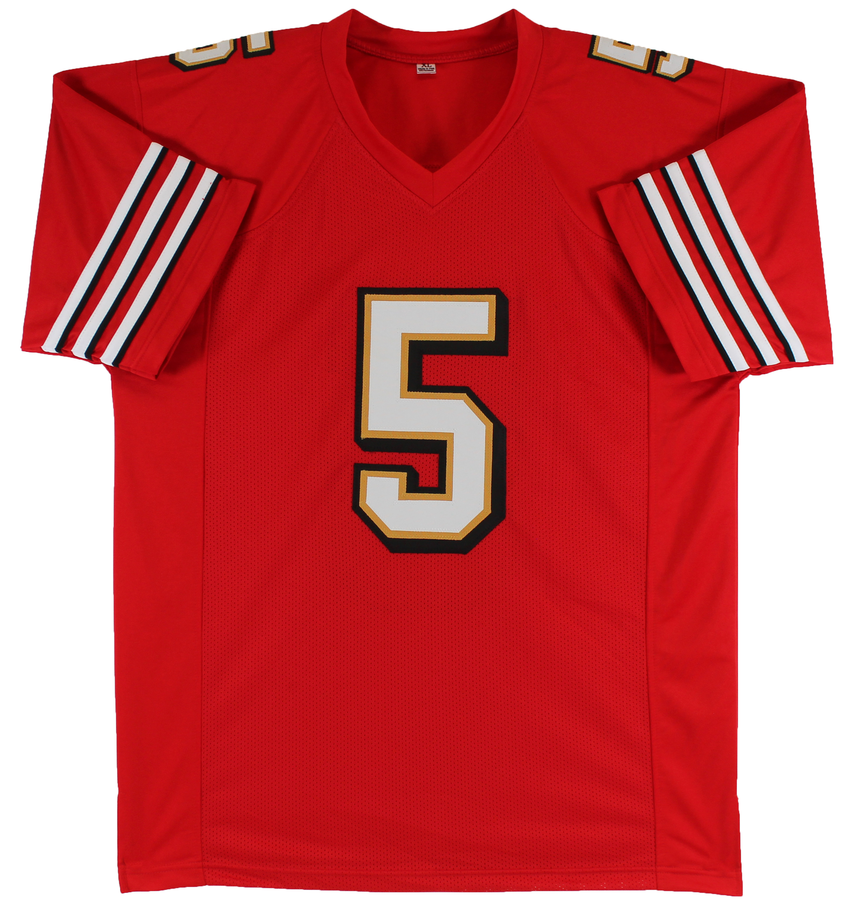 This Autographed w/ Drop Shadow Red Pro Style Jersey has been Personally Signed by Jeff Garcia of the San Francisco 49ers. This item is 100% Authentic to include a hologram by Beckett Authentication Services. This item may come with the new Beckett Authentication hologram that has a scannable QR code rather than the traditional COA. If you would like to have a COA, you are welcome to reach out to Beckett for a printed certification once you receive your item. This is a BAS Witnessed Protection Program item which means a Beckett Authentication Service representative was present when this item was being signed. We conducted an autograph signing with Jeff Garcia where multiples of the same item were signed. While the photographs are representative of this item, the size, placement and strength of the signature may vary. Each item is hand signed, therefore, each autograph is unique. This item can be verified through BAS Witnessed. This is a X-Large sized, non-branded, custom-stitched Jersey.