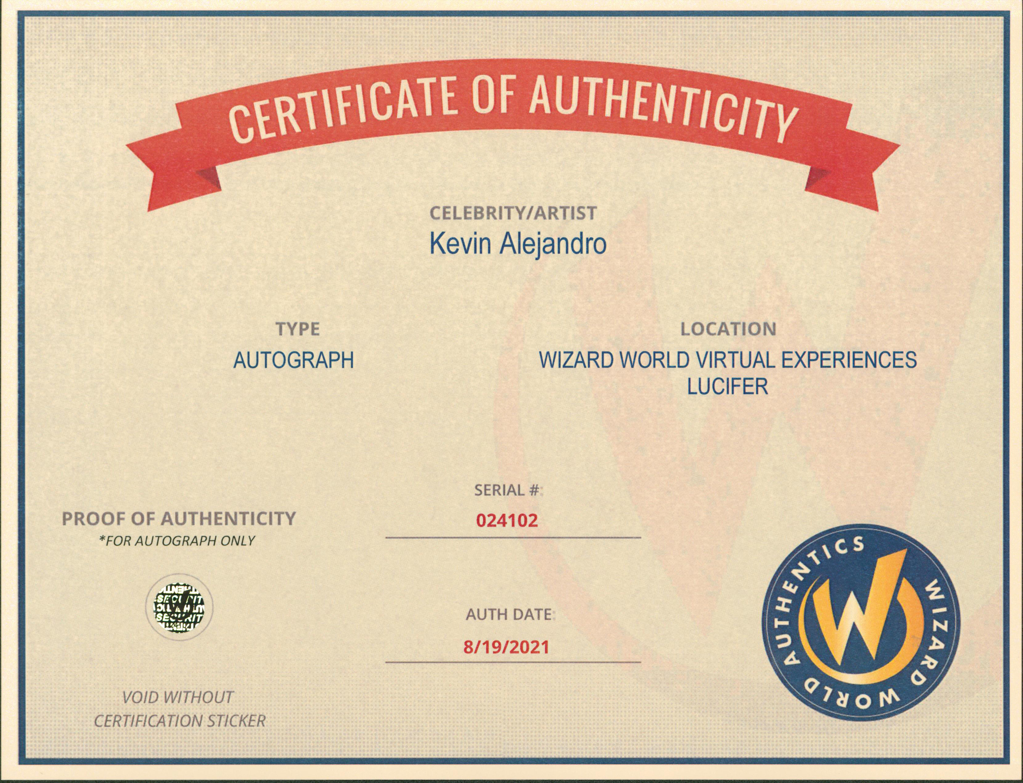 This Autographed 8x10 Photo has been Personally Signed by Kevin Alejandro of Lucifer. This item is 100% Authentic to include a Certificate of Authenticity (COA) / hologram by Wizard World Authentics. A Wizard World Authentics representative was present when this item was being signed, the date of the signing is notated on the COA. We have multiples of this same item. While the photographs are representative of this item, the size, placement and strength of the signature may vary. Each item is hand signed, therefore, each autograph is unique.