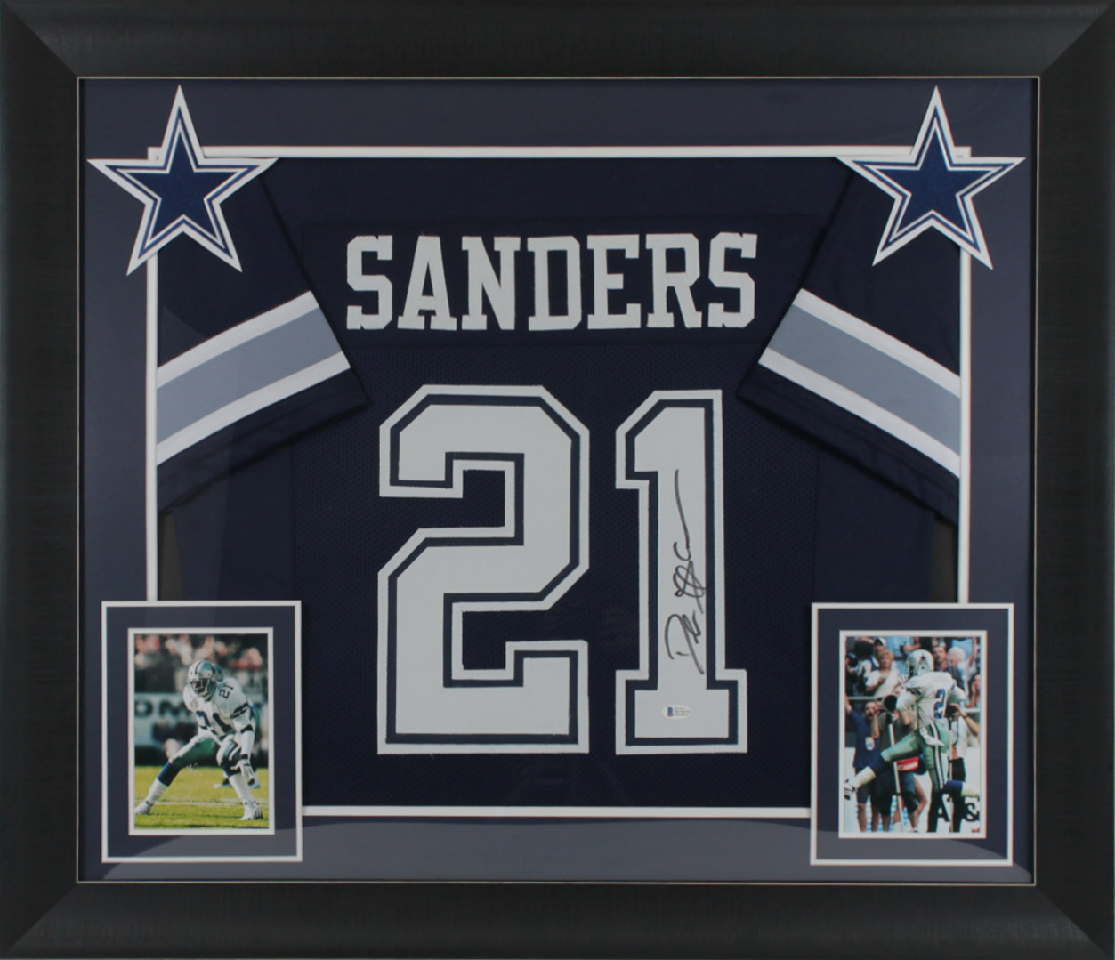 This Autographed Navy Blue Pro Style Framed Jersey has been Personally Signed by Deion Sanders of the Dallas Cowboys. This item is 100% Authentic to include a Certificate of Authenticity (COA) / hologram by Beckett Authentication Services. This is a BAS Witnessed Protection Program item which means a Beckett Authentication Service representative was present when this item was being signed. We conducted an autograph signing with Deion Sanders where multiples of the same item were signed. While the photographs are representative of this item, the size, placement and strength of the signature may vary. Each item is hand signed, therefore, each autograph is unique. This item can be verified through BAS Witnessed. This item has been professionally framed to overall dimensions of approximately 32 x 37 inches. This is a X-Large sized, non-branded, custom-stitched Framed Jersey. This jersey will be framed to order, it will take 3-4 days from purchase date for it to ship.