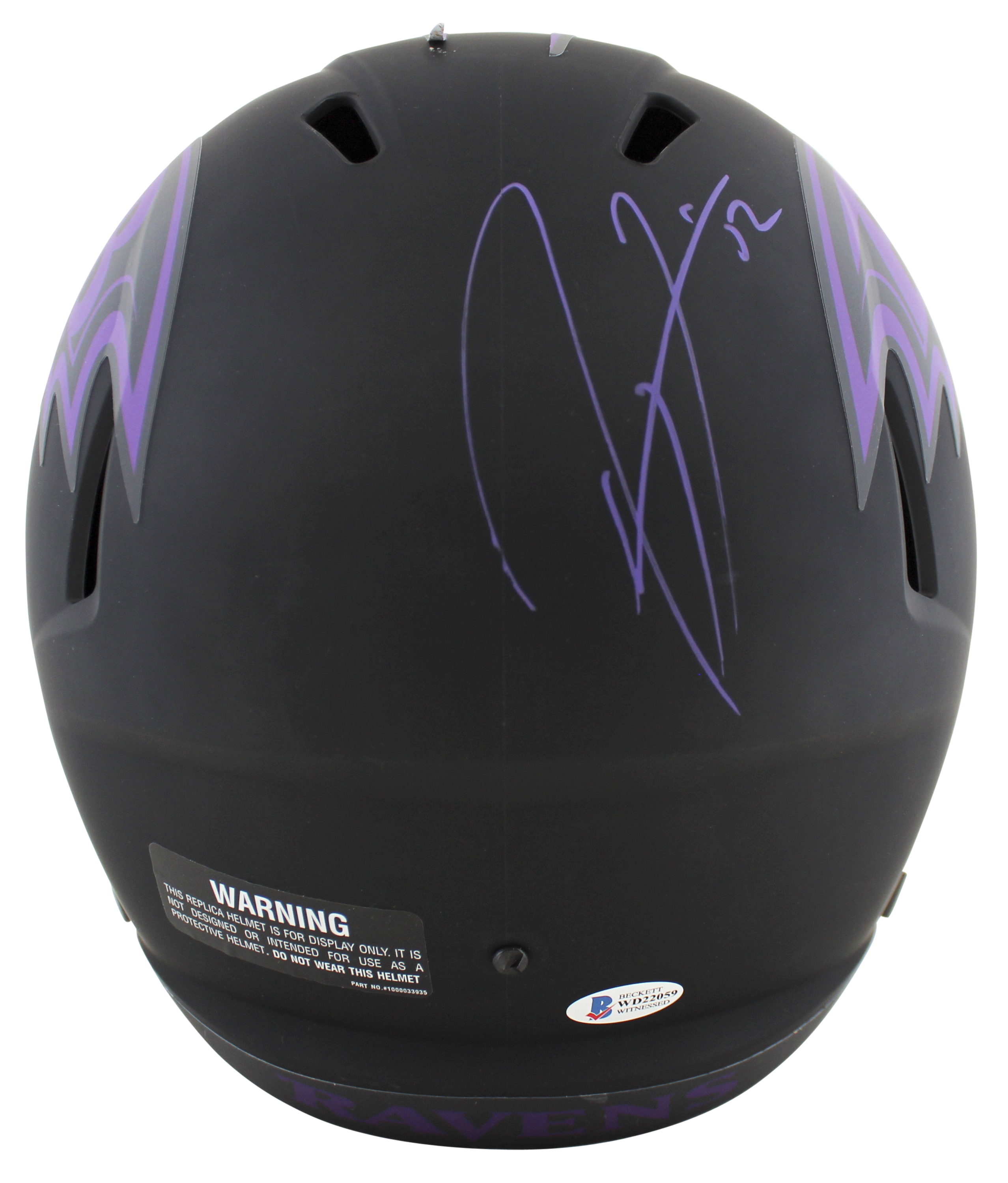 This Autographed w/ Purple Signature Alternate Eclipse Riddell Full Size Speed Rep Helmet has been Personally Signed by Ray Lewis of the Baltimore Ravens. This item is 100% Authentic to include a Certificate of Authenticity (COA) / hologram by Beckett Authentication Services. This is a BAS Witnessed Protection Program item which means a Beckett Authentication Service representative was present when this item was being signed. The authenticity can be verified on Beckett Authentication Services website.